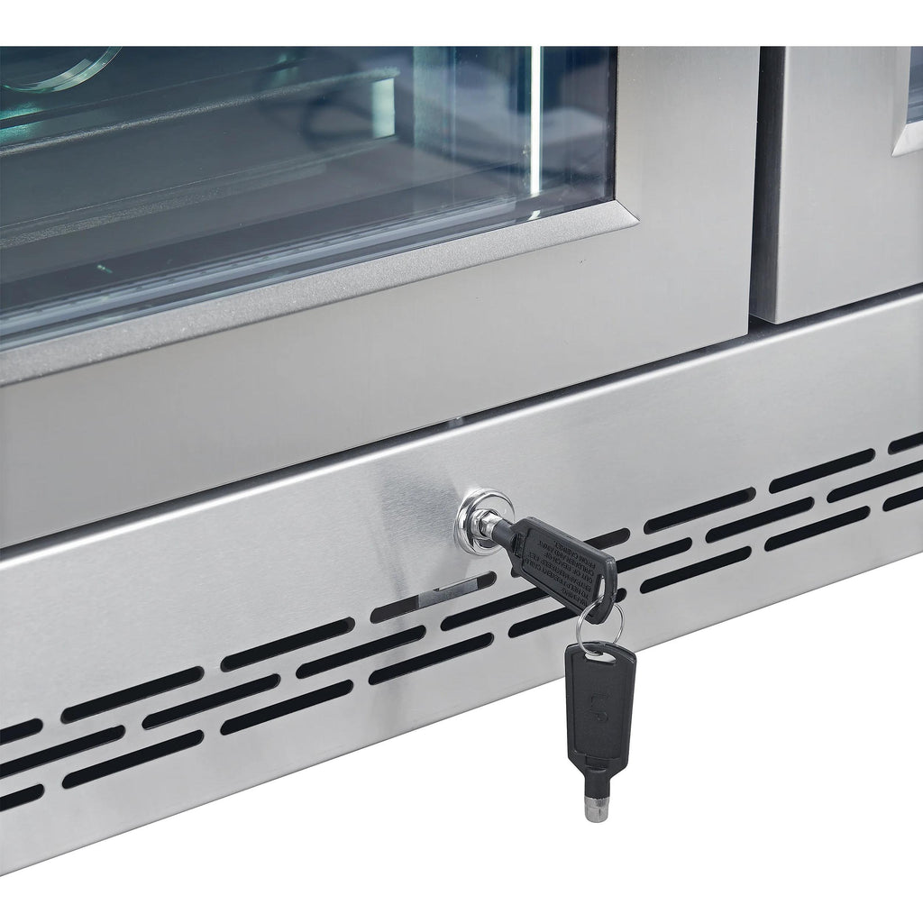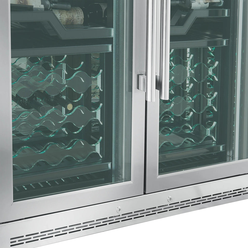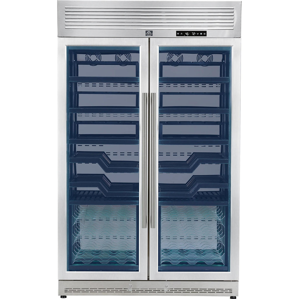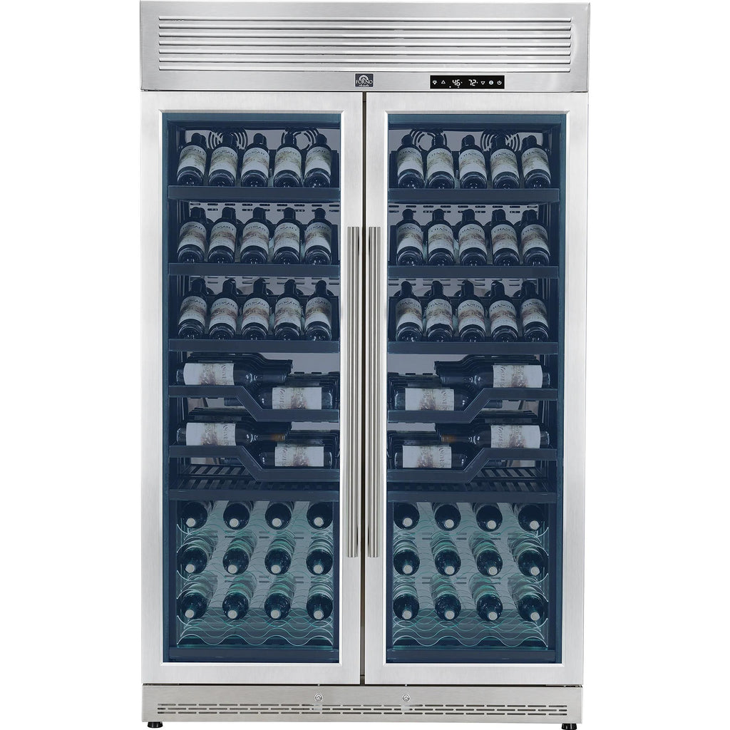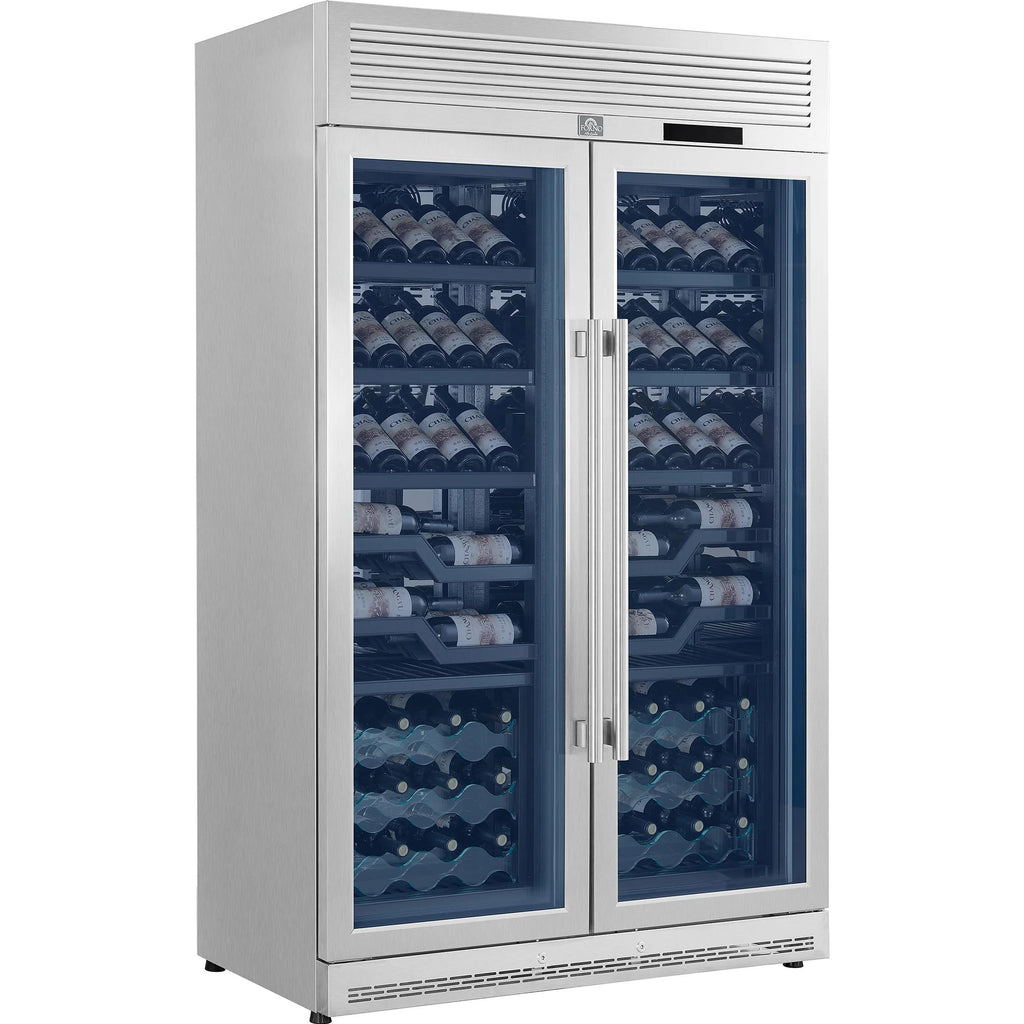 Designed for wine enthusiasts, the Forno Abruzzo 48-Inch Dual Zone Wine Cellar blends elegance, innovation, and superior craftsmanship. With a 102-bottle capacity and 24 cu. ft. of storage, it ensures your collection stays in peak condition. Dual temperature zones keep reds and whites at optimal conditions, enhancing flavor and longevity. The double-layer anti-UV glass door shields against harmful light, while a charcoal air filter maintains a pure aging environment. Label-view and Z-shaped black shelves optimize organization and access, while green acrylic bottle holders add a modern touch. Digital touch controls ensure precise temperature settings, and crisp 6000K LED lighting beautifully showcases your collection without affecting quality. A top-mounted inverter compressor maximizes storage, improves cooling efficiency, and operates quietly. An integrated lock safeguards your vintages, ensuring only the right hands have access. Superior technology and timeless elegance—Forno Abruzzo redefines wine preservation. Forno, lower the cost of living.