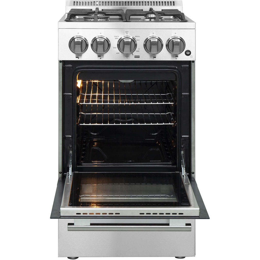 The Forno 20" Alta Qualita Pro-Style Freestanding Gas Range brings professional styling and Performance into your home kitchen with its durable stainless-steel design. Cooking Surface has with 4 sealed burners with a total output of 21,200 BTU and features continuous cast iron grates. The 20" oven has a capacity of 2.05 cu. ft. with a combined broil and oven output of 13,000 BTUs and Internal cooling fan. Included are 2 electroplated oven racks, LP conversion kit and power cord. Ensure precision with your cooking using the unit’s thermostat and regulator. Additionally, zinc coated metal knobs with bezel rings will maintain their beauty for years. All FORNO products come with a 2 year warranty.