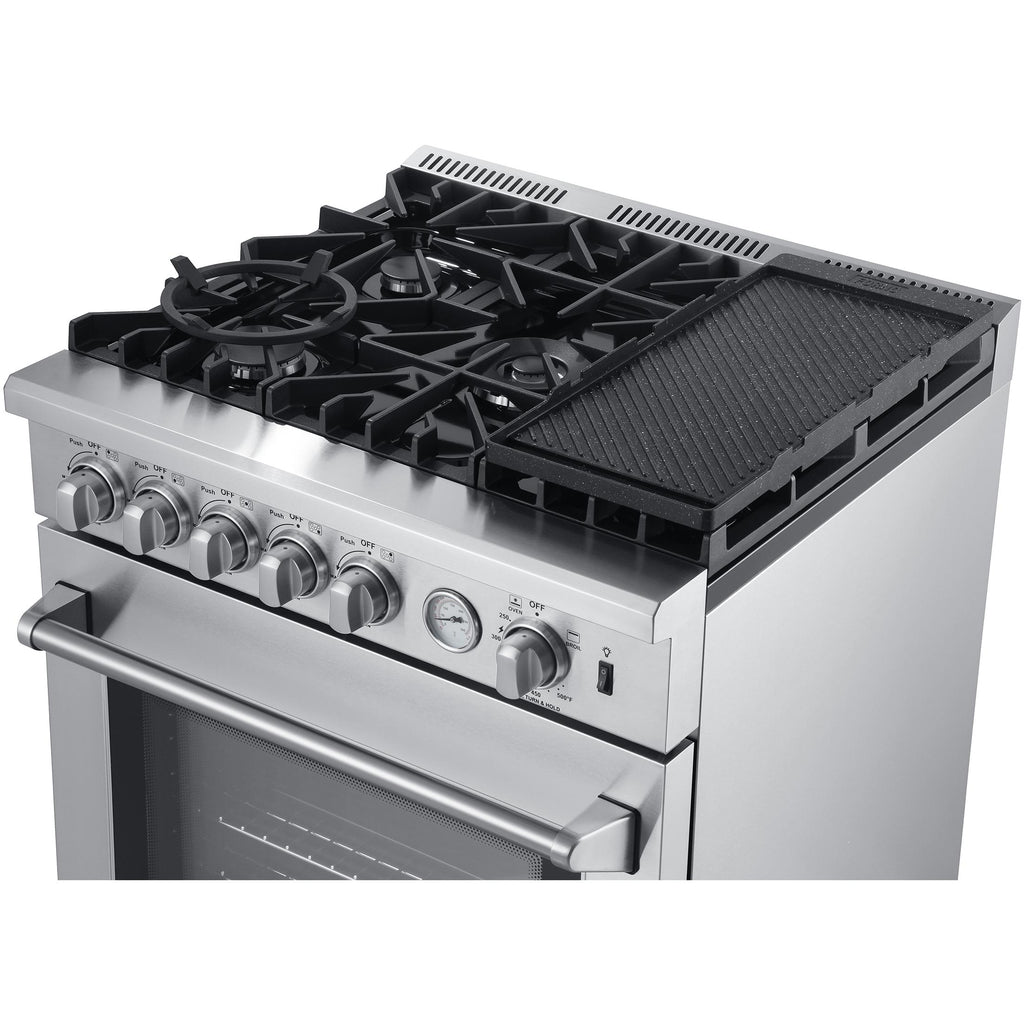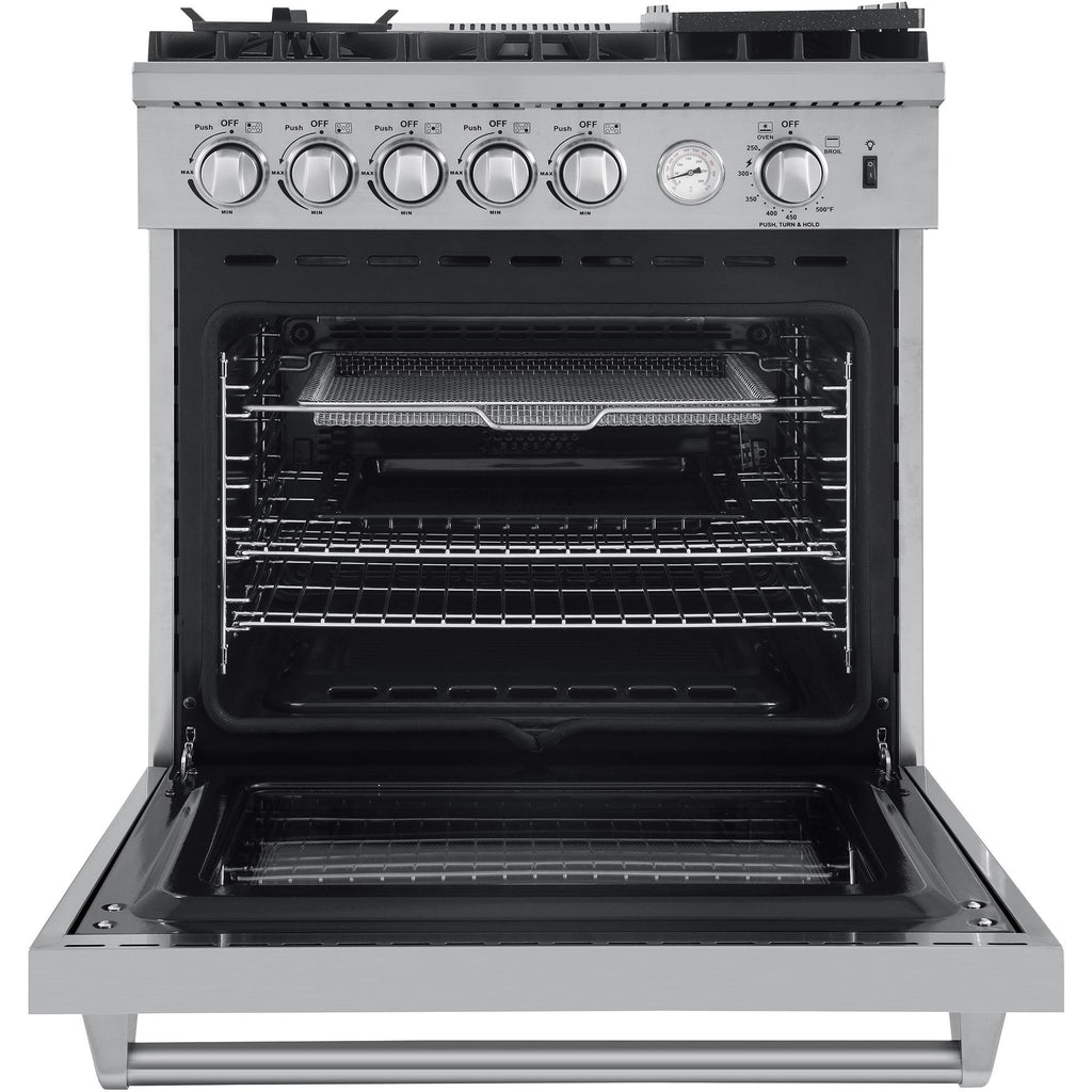 The Lazio 30" Alta Qualita Freestanding Gas Range brings professional styling and Performance into your home kitchen with its durable stainless-steel design. Cooking Surface has 5 sealed burners with a total output of 70,000 BTU and includes 1 powerful sealed dual-ring burner for boiling or searing and is able to perform simmering like melting chocolate or sauces, Features continuous cast iron grates, wok-ring and reversible grill/griddle. The 30" oven has a capacity of 4.32 cu. ft. with a combined broil and bake output of 26,000 BTUs and a 3-layer glass insulator from heat and oven door window. Internal convection fan with element helps achieve fast temperatures with precision and consistent oven cooking. Included are 2 oven racks, an air fry rack & basket, drip pan that can be used for steam cleaning in the oven and LP conversion kit. Additionally, zinc coated metal knobs with bezel rings will maintain their beauty for years. All FORNO products come with a 2 year warranty.