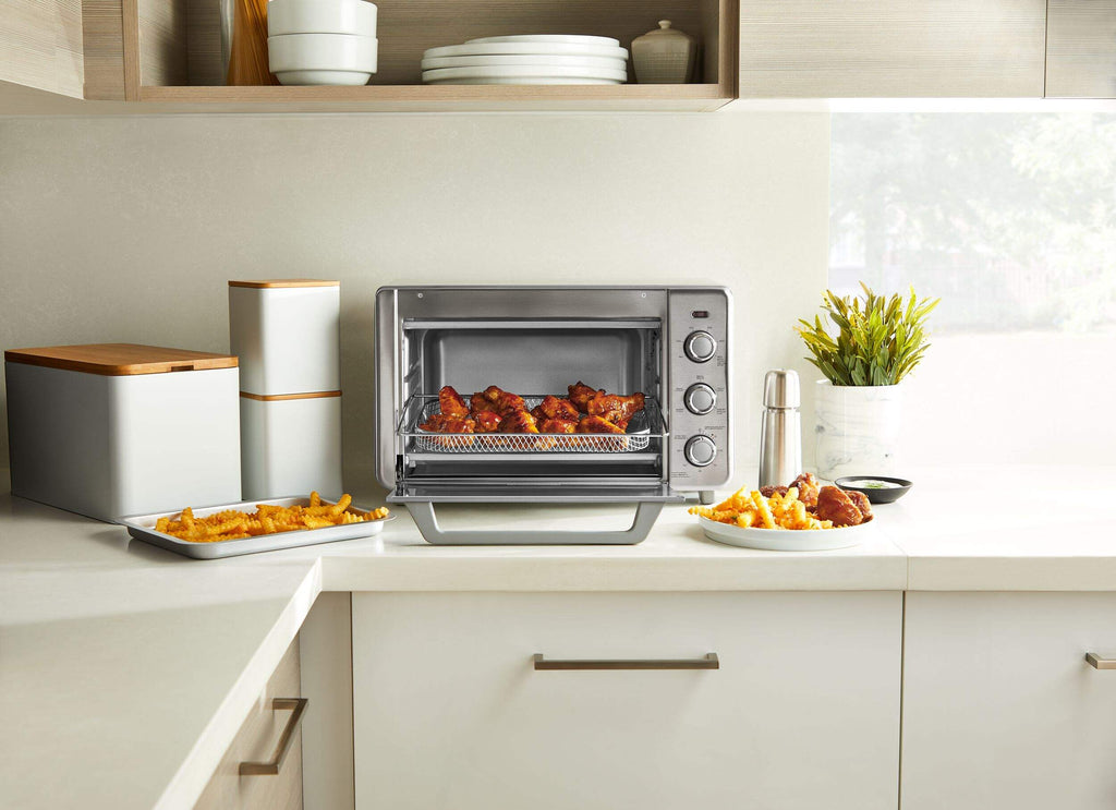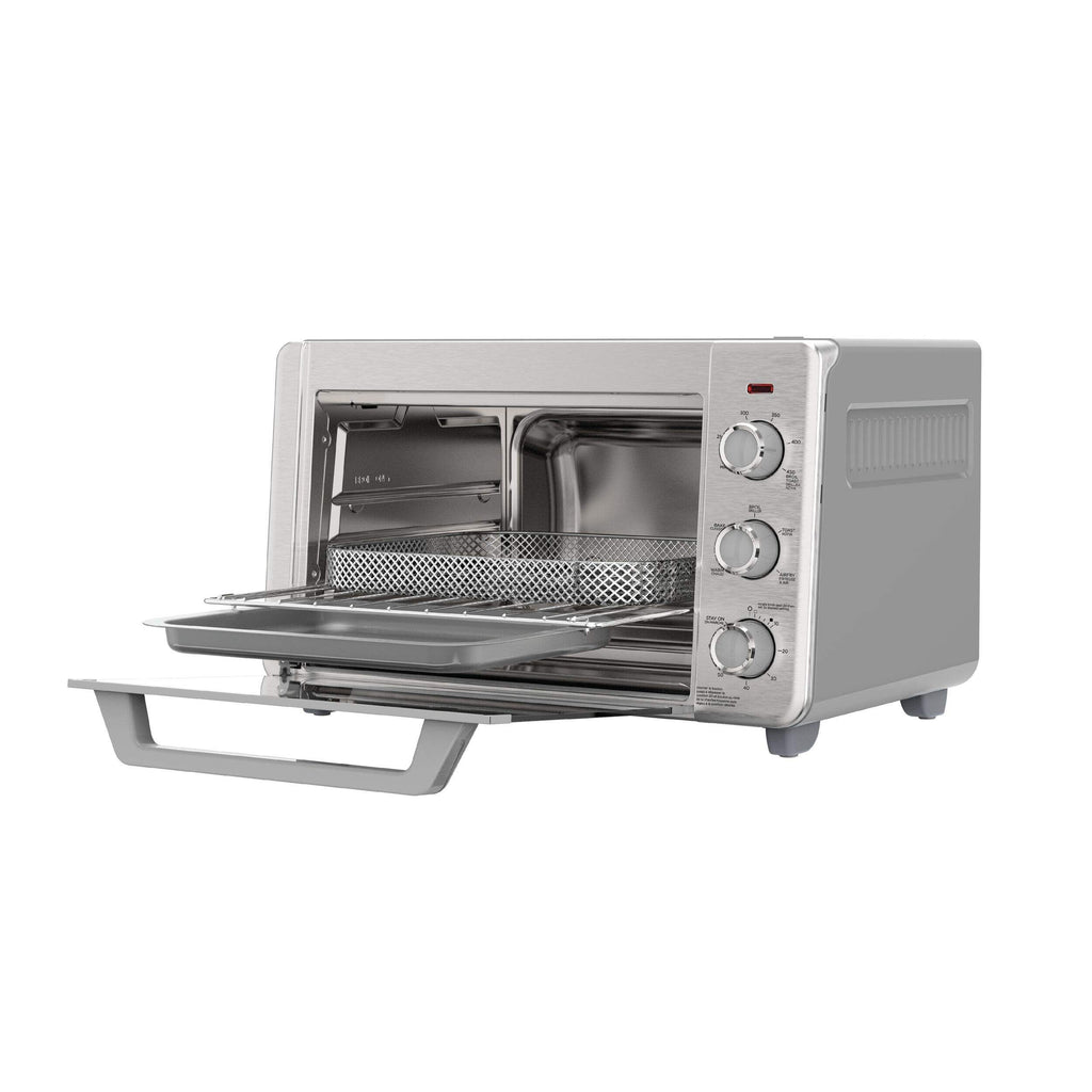 Air Fry Technology uses high intensity hot air to bake, brown, and crisp your favourite fried foods with little to no oil. This is deep fried taste without the fat™! Try French fries, veggie chips, breaded fish filets, frozen snacks, and a lot more. There’s space for up to six slices of bread or a 12” pizza. Three control knobs make it easy to set the toast timer and 60-minute timer, and choose from five cooking functions: bake, broil, toast, keep warm, and air fry. Convection technology circulates air within the oven for fast and even results when air frying. This toaster oven includes an air fry basket, bake/broil pan and rack, and an external crumb tray that slides in and out to make cleanup a breeze.