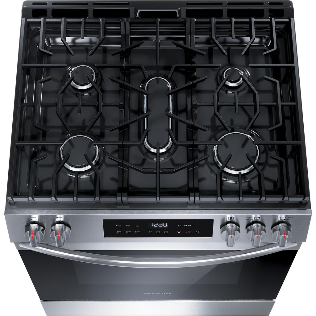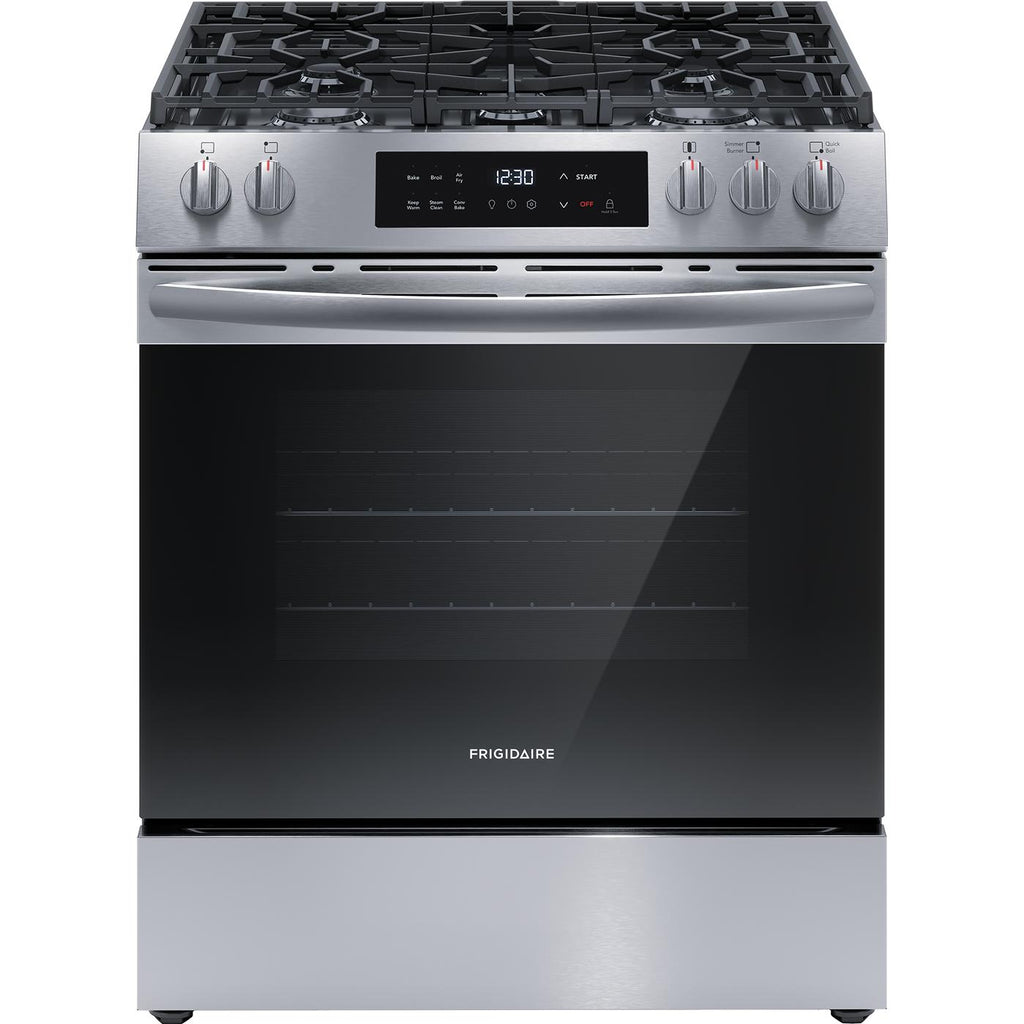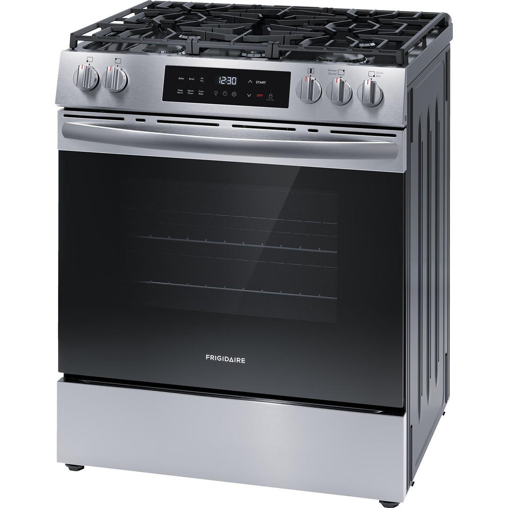 The Frigidaire 30" Front Control Gas Range features Air Fry, so you can make healthier, family-sized air fry meals, right in your oven. Includes a five-burner cooktop that is designed to handle all of your cooking needs, including a powerful 18,000 BTU Quick Boil Burner. Cleaning your oven interior is now more convenient with Frigidaire's 30-minute steam clean. Also features a sleek, modern edge-to-edge glass design that will look great in any kitchen.