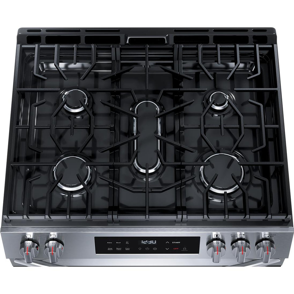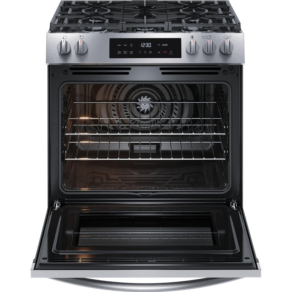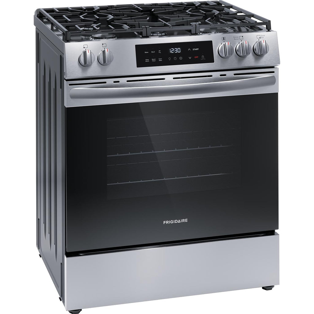 The Frigidaire 30" Front Control Gas Range features Air Fry, so you can make healthier, family-sized air fry meals, right in your oven. Includes a five-burner cooktop that is designed to handle all of your cooking needs, including a powerful 18,000 BTU Quick Boil Burner. Cleaning your oven interior is now more convenient with Frigidaire's 30-minute steam clean. Also features a sleek, modern edge-to-edge glass design that will look great in any kitchen.