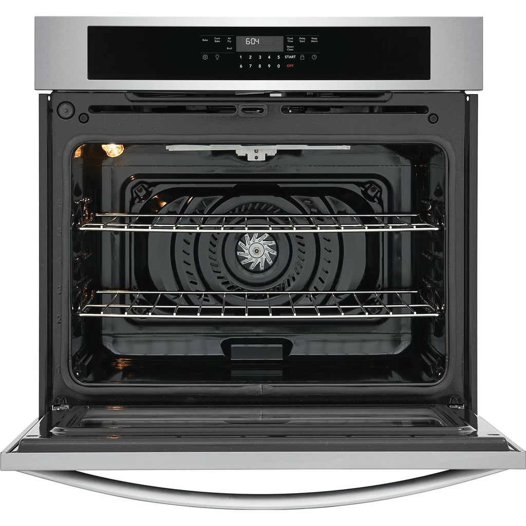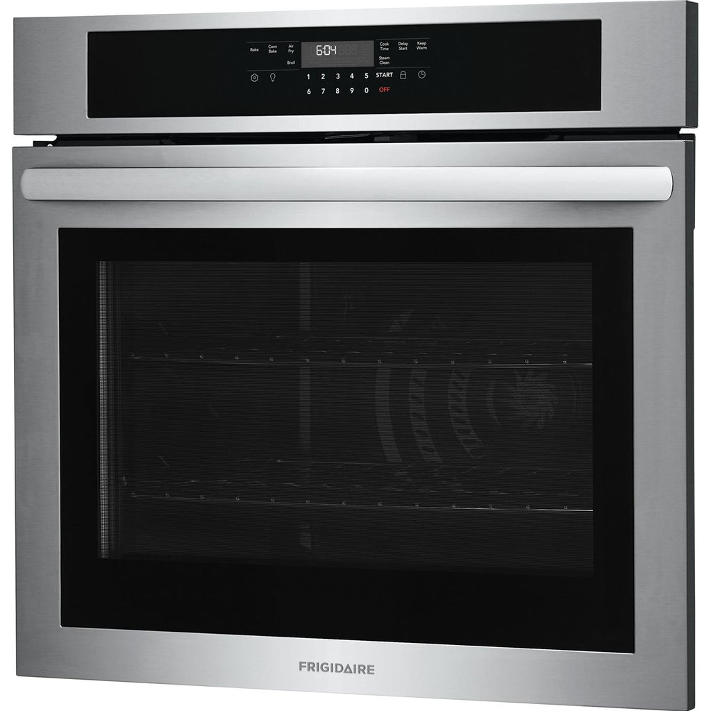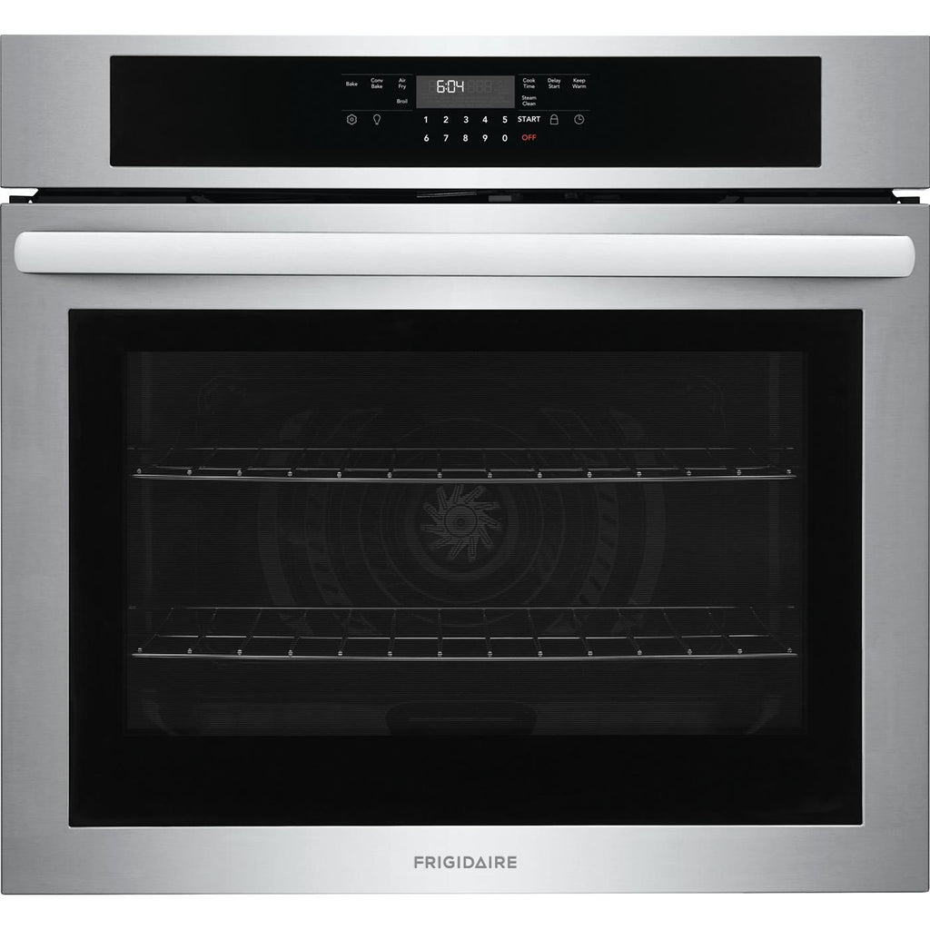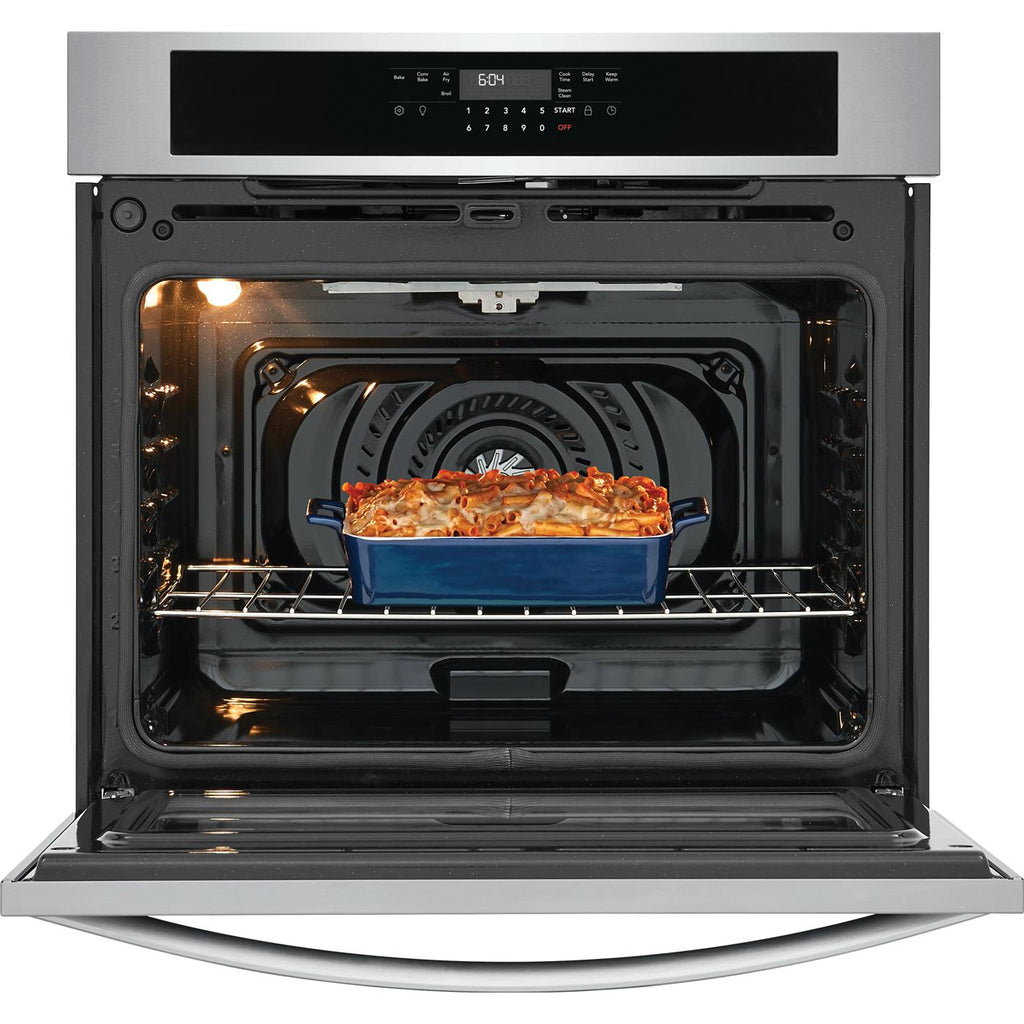 Frigidaire 30'' Single Electric Wall Oven with Fan Convection to achieve better baking results. Get faster, more even multi-rack baking results with Fan Convection in both ovens! With Steam Clean, your oven cleans itself so you don't have to.
