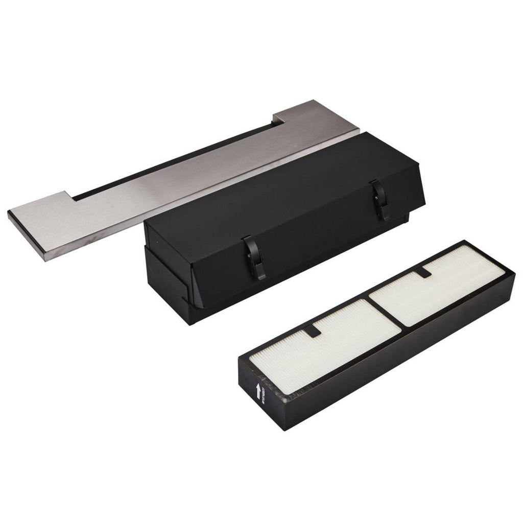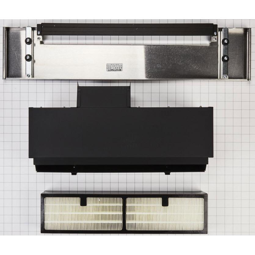 This Ductless Downdraft Vent Kit is a decorative unit that can be used when venting to the outside is either not possible or not desirable in the kitchen. The kit contains a filter housing that attaches to the blower under the unit; the filter cleans the air before it re-enters the home. This is an accessory that can be used with several brands; check to see if your cooktop’s model number is compatible. Size: 31 L x 20 W x 7-1/2 H. Installing this accessory will require basic hand tools and novice repair experience. Remember to turn off the appropriate circuit breaker before installing this part. Helpful Tip: For optimum performance of your vent, change the filter (item W10800530) every 6 months or when a loss of airflow can be detected.