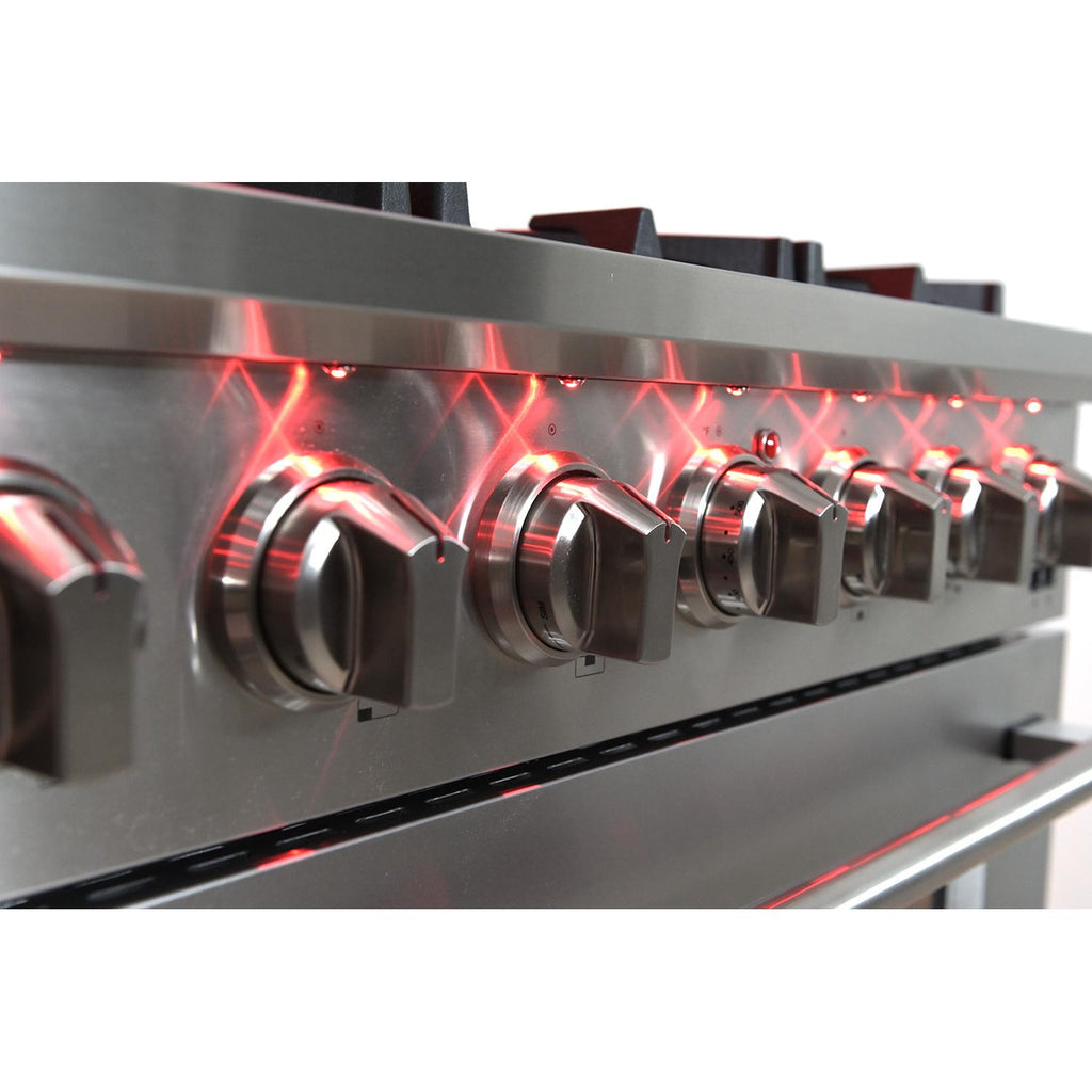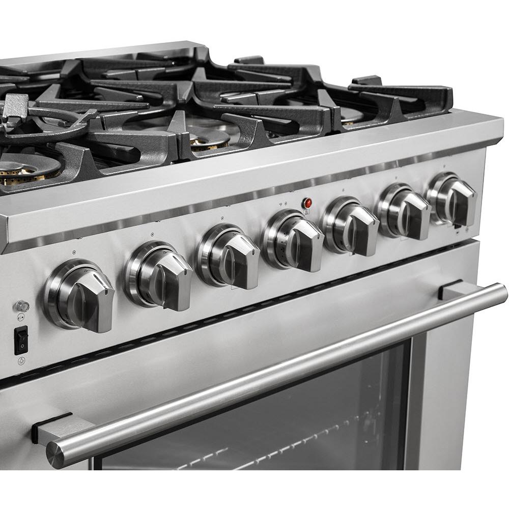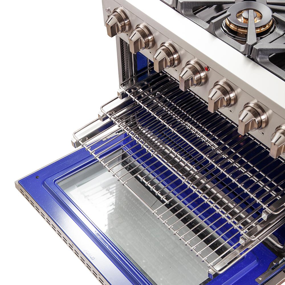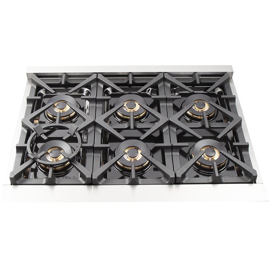 La cuisinière à gaz Capriasca de 36 pouces apporte un style et des performances professionnelles dans votre cuisine avec sa conception durable et magnifique en acier inoxydable de qualité 304. La surface de cuisson comprend 6 brûleurs en laiton scellés à double anneau avec une puissance totale de 120 000 BTU. Le brûleur à double anneau de 20 000 BTU est idéal pour l'ébullition ou la saisie parfait pour les sauces ou faire fondre du chocolat. Les grilles continues en fonte robuste permettent de déplacer facilement les casseroles ou les poêles hors du feu selon vos besoins. Les deux fours à gaz ont une capacité totale de 5,36 pieds cubes avec une puissance totale de 32 000 BTU et sont dotés d'un intérieur en émail bleu. Le four est munit d'un ventilateur à convection qui garantit une cuisson au four rapide, précise et uniforme. Les fenêtres du four en verre ont 3 couches qui permettent une bonne isolation tout en préservant un visibilité facile. Inclus sont 3 grilles de four entièrement télescopiques en acier inoxydable pour un accès facile, un anneau Wok concave et un kit de conversion pour le gaz propane. De plus, les boutons en métal revêtus de zinc conservent leur beauté pendant des années. Tous les produits FORNO sont assortis d'une garantie de 2 ans.
