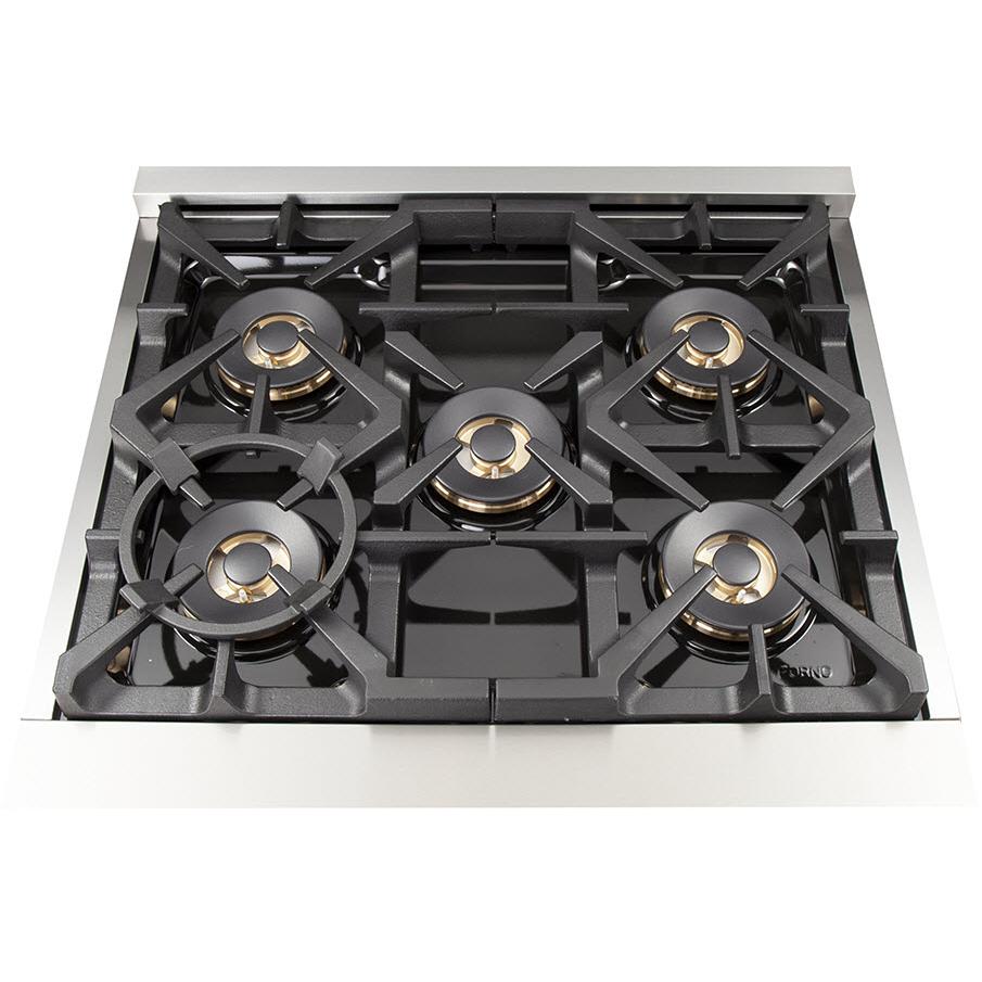La cuisinière bicombustible Capriasca de 30 pouces Forno, promet un style et une expérience professionnel dans votre cuisine grâce à sa conception durable en acier inoxydable de qualité 304. La surface de cuisson comprend 5 brûleurs en laiton scellés à double anneau avec une puissance totale de 100 000 BTU. Le brûleur à double anneau de 20 000 BTU est parfait pour faire bouillir ou saisir et peut également réaliser des mijotages, parfait pour les sauces ou faire fondre du chocolat. Les grilles continues en fonte robuste permettent de déplacer facilement les casseroles ou les poêles hors du feu selon vos besoins. Le four à convection de 4,32 pieds cubes est doté d'un intérieur en émail bleu impressionnant qui facilite le nettoyage. Les fenêtres du four en verre ont 3 couches et permettent une bonne isolation tout en préservant un visibilité facile. Ce four offre également une puissance totale de 6 300 watts, ce qui est amplement suffisant pour la cuisson, la rôtissage et le grillage. Trois grilles de four sont inclues, entièrement télescopiques en acier inoxydable pour un accès facile, un anneau Wok concave et un kit de conversion pour le gaz propane. De plus, les boutons en métal revêtus de zinc conservent leur beauté pendant des années. Tous les produits FORNO sont assortis d'une garantie de 2 ans.