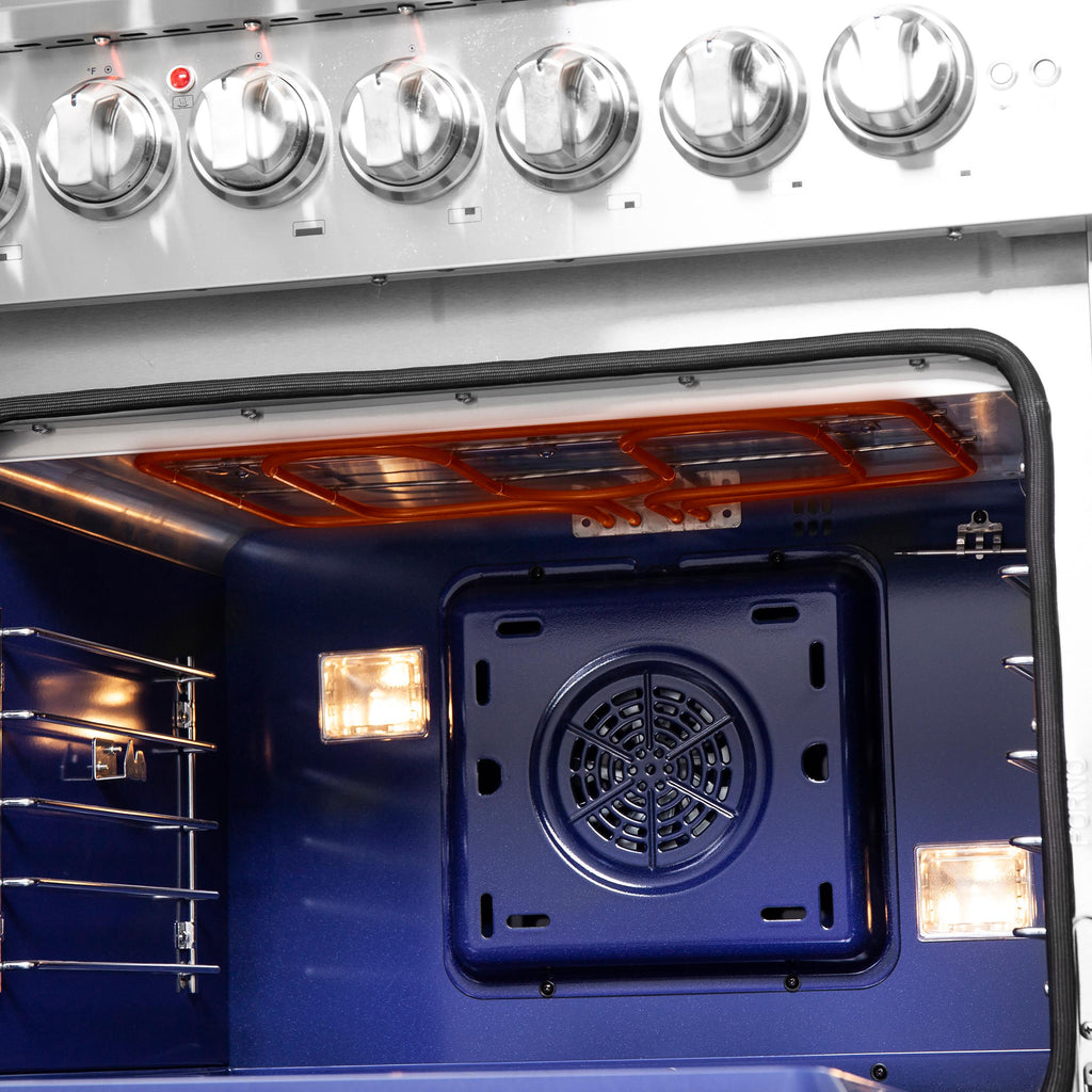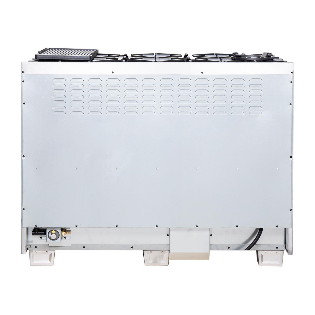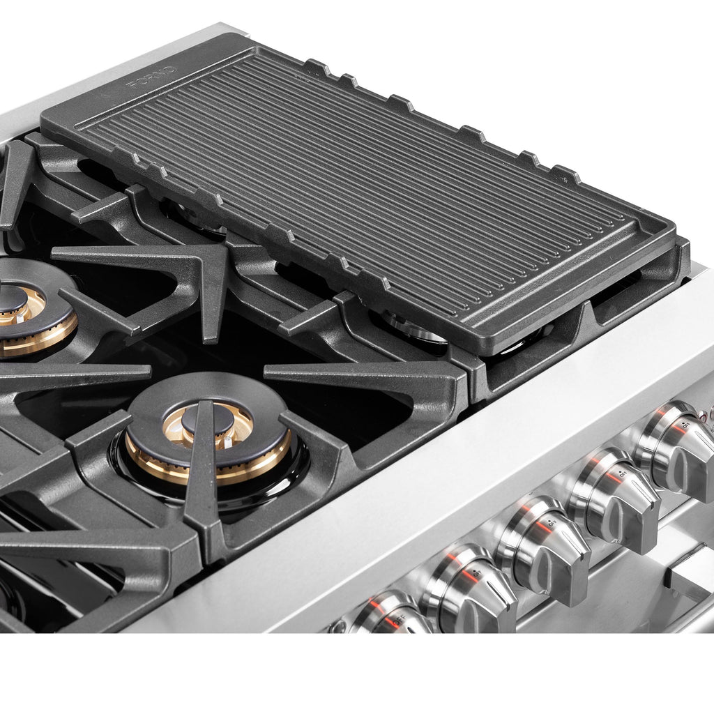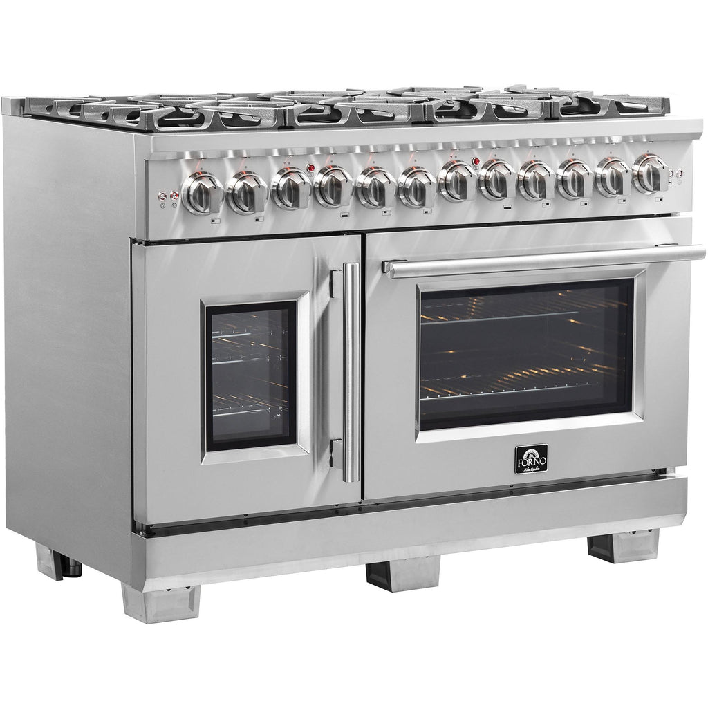 La cuisinière bicombustible Forno Capriasca avec portes françaises de 48 pouces apporte une esthétique et des performances professionnelles dans votre cuisine grâce à sa conception durable en acier inoxydable. La table de cuisson au gaz est équipée de 8 brûleurs scellés en laiton à double anneau avec une puissance totale de 160 000 BTU pour mijoter, faire fondre le chocolat ou préparer des sauces. Les grilles continues en fonte robuste offrent une stabilité maximale aux ustensiles de cuisine et permettent un déplacement facile des casseroles et des poêles sur la surface de cuisson en émail encastrée, qui garde les déversements et les éclaboussures contenus et facilite le nettoyage. Les doubles fours électriques ont une capacité totale combinée de 6,58 pieds cubes avec une puissance totale de 9 700 watts. L'intérieur des cavités est en émail bleu et facilite le nettoyage des parois. Les fenêtres du four en verre ont 3 couches qui permettent une bonne isolation tout en préservant un visibilité facile. Le four du côté droit est équipé d'une fonction de ventilation à convection, accélérant le processus de cuisson. Le kit de conversion au GPL, 6 grilles de four télescopiques en acier inoxydable, un anneau de wok, une plaque réversible de grill/griddle, un kit de rôtisserie avec brochettes, un panier de friture à air avec grille et un plateau d'égouttement sont inclus dans l'ensemble. De plus, les boutons en métal revêtus de zinc avec bagues de finition conservent leur beauté pendant des années. Tous les produits FORNO sont accompagnés d'une garantie de 2 ans.