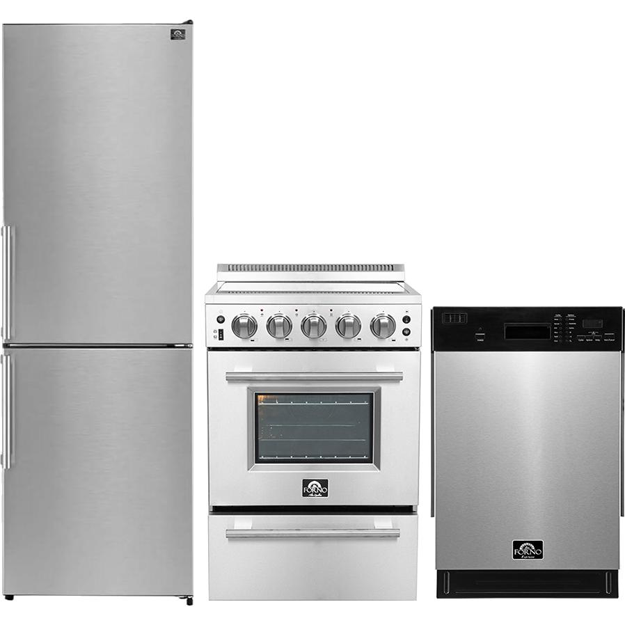 L'ensemble cuisine Forno 3 pièces allie style et efficacité pour les espaces compacts. Le réfrigérateur à congélateur inférieur Forno Guardia de 23,4 po offre 10,8 pi³ de rangement avec étagères en verre réglables, tiroir à charcuterie, bac à légumes à humidité contrôlée et fonction Super Freeze. La cuisinière électrique Loiano de 24 po dispose d’une plaque de cuisson de 6 000 W, d’un four de 2,3 pi³, d’un gril et d’un panier air fryer intégré pour une cuisson polyvalente. Le lave-vaisselle encastrable Polo de 18 po à commandes frontales complète l’ensemble avec 6 programmes, cuve en acier inoxydable, tiges rabattables, capacité jusqu’à 8 couverts et panier modulable en trois parties pour un chargement et une organisation optimisés.