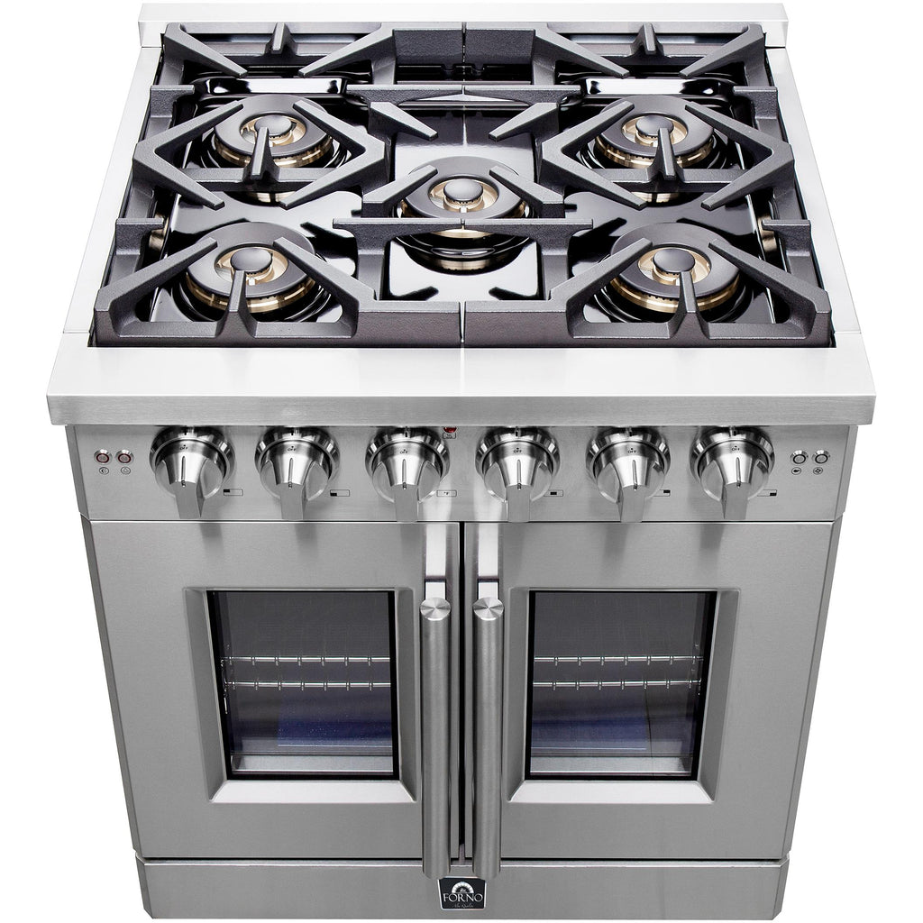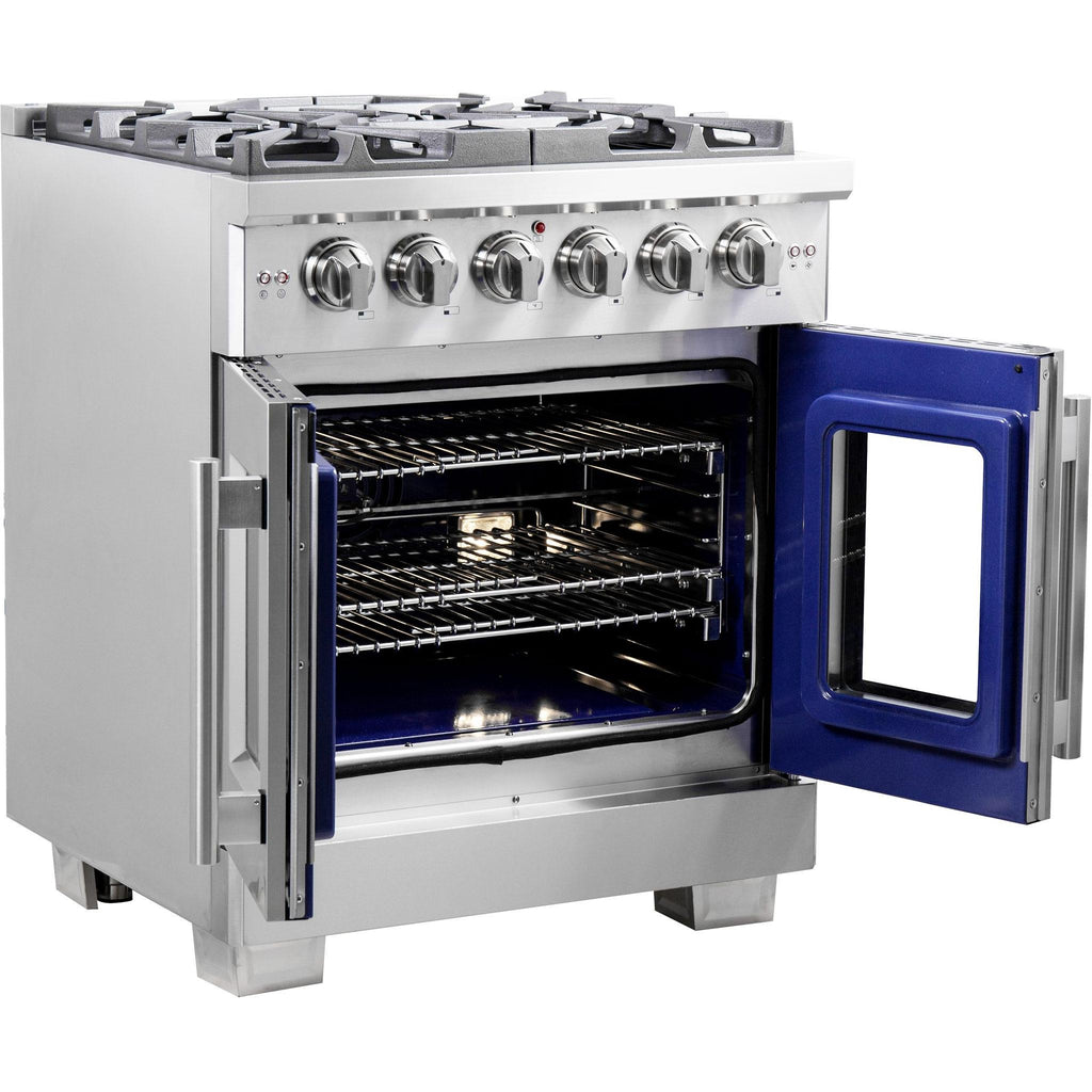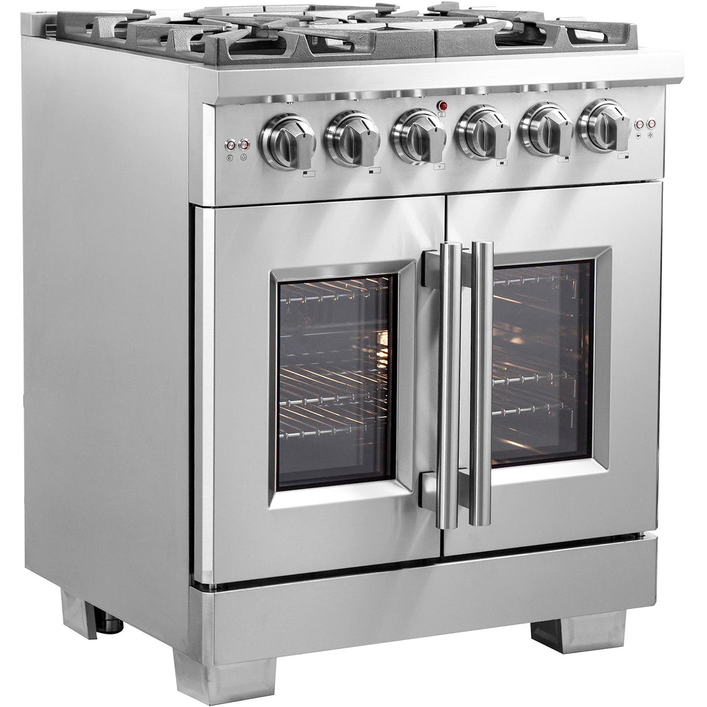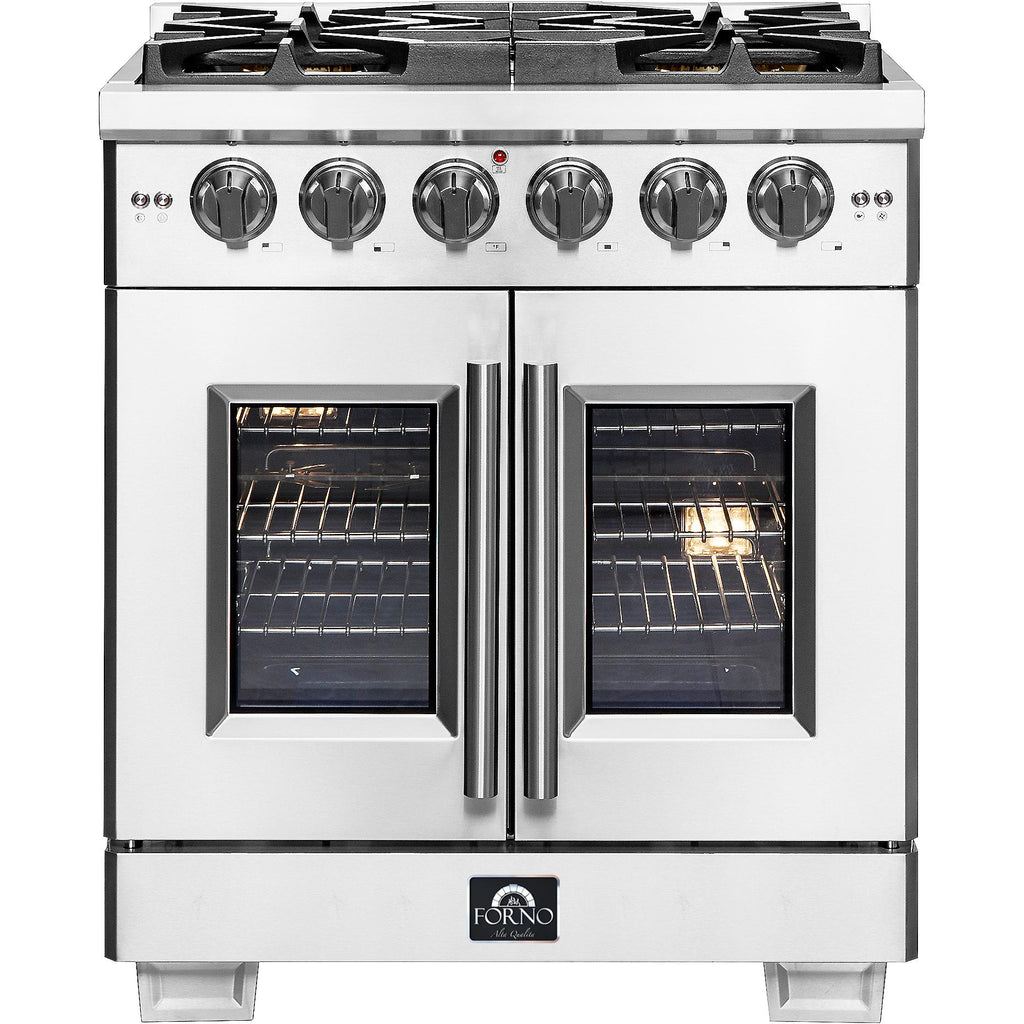 La cuisinière bicombustible Forno Capriasca, portes française de 30 pouces apporte une esthétique et des performances professionnelles dans votre cuisine grâce à sa conception durable en acier inoxydable. Les portes françaises uniques permettent d'ouvrir les portes pour accéder à votre four avec un espace supplémentaire pouvant atteindre 12 pouces. La table de cuisson à gaz est équipée de 5 brûleurs scellés à double anneau en laiton avec une puissance totale de 100 000 BTU, idéale pour mijoter, faire fondre le chocolat ou préparer des sauces. Les grilles continues en fonte robuste offrent une stabilité maximale aux ustensiles de cuisine et permettent un déplacement facile sur la surface de cuisson émaillée encastrée, qui garde les déversements et les éclaboussures contenus et facilite le nettoyage. Le four à gaz d'une capacité de 4,32 pieds cubes, avec une puissance totale de 30 000 BTU, est enveloppé dans un intérieur en émail bleu et contient un ventilateur à convection garantissant une cuisson rapide, précise et uniforme. Les portes françaises sont dotées de fenêtre en verre à 3 couches afin de préserver la chaleur, tout en maintenant une visibilité facile. Un kit de conversion au GPL, 3 grilles de four en acier inoxydable télescopiques, un support pour wok, une plaque réversible, un kit de rôtissoire avec des brochettes, un panier pour friteuse à air (AirFry), son support et une lèchefrite sont inclus. De plus, les boutons en métal revêtus de zinc avec bagues de finition conservent leur beauté pendant des années. Tous les produits FORNO sont accompagnés d'une garantie de 2 ans.