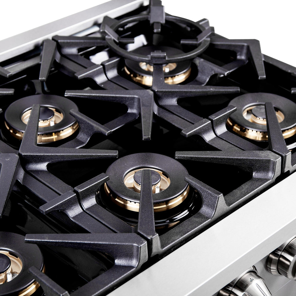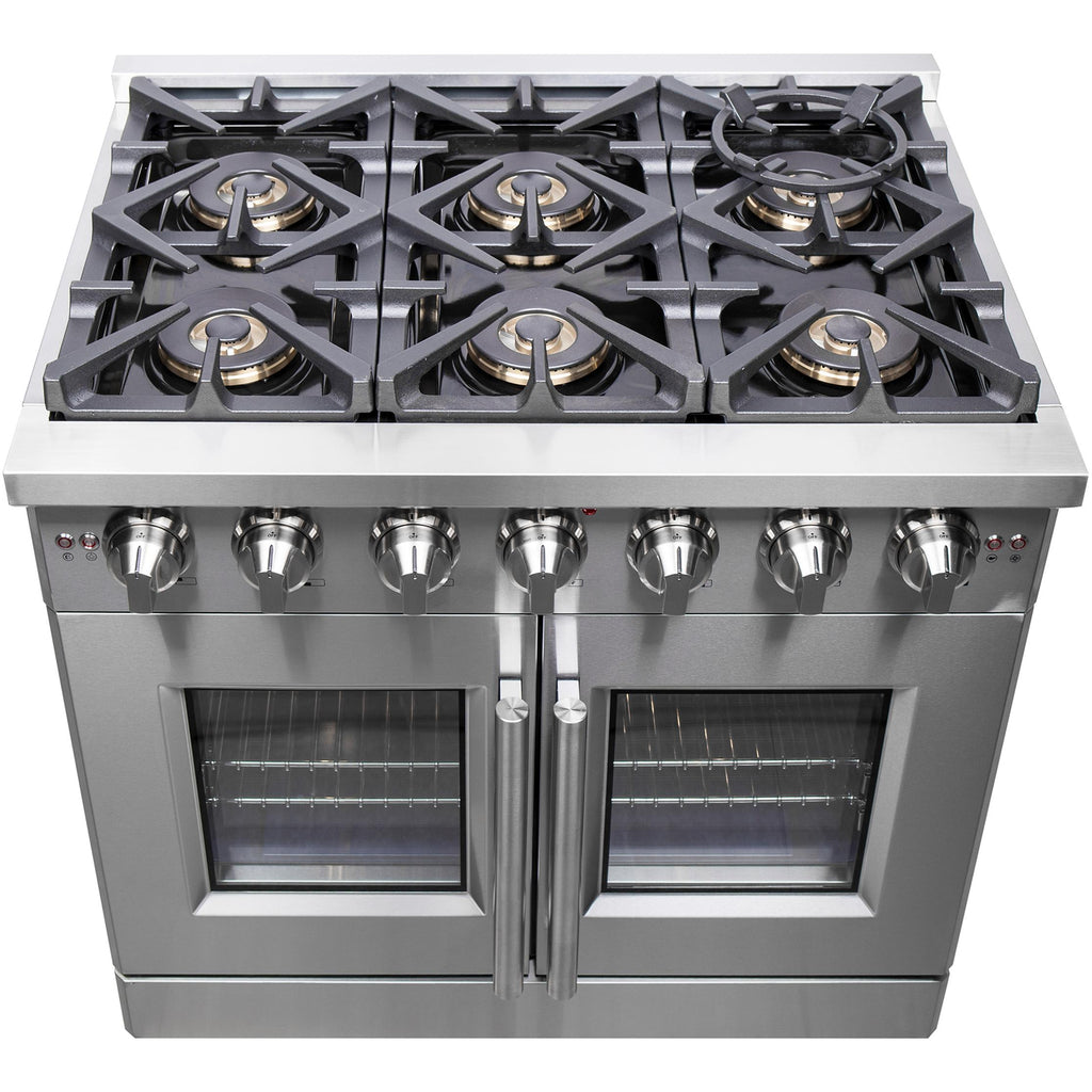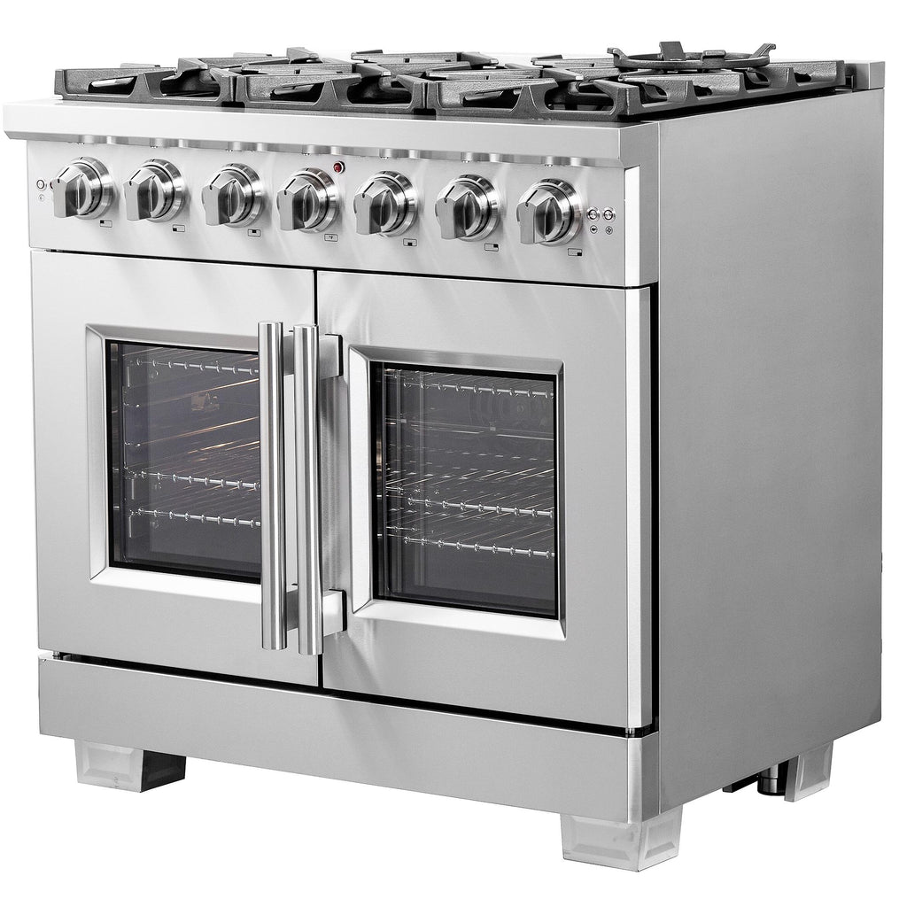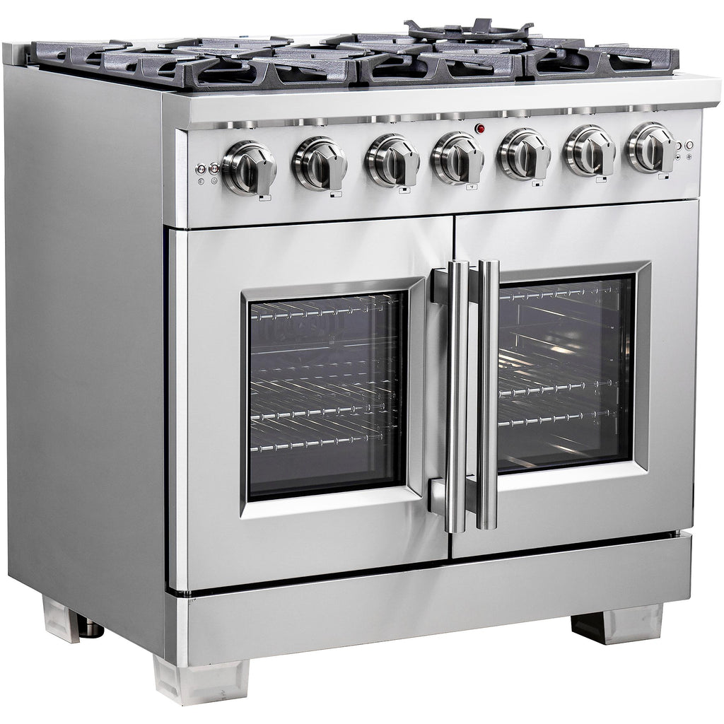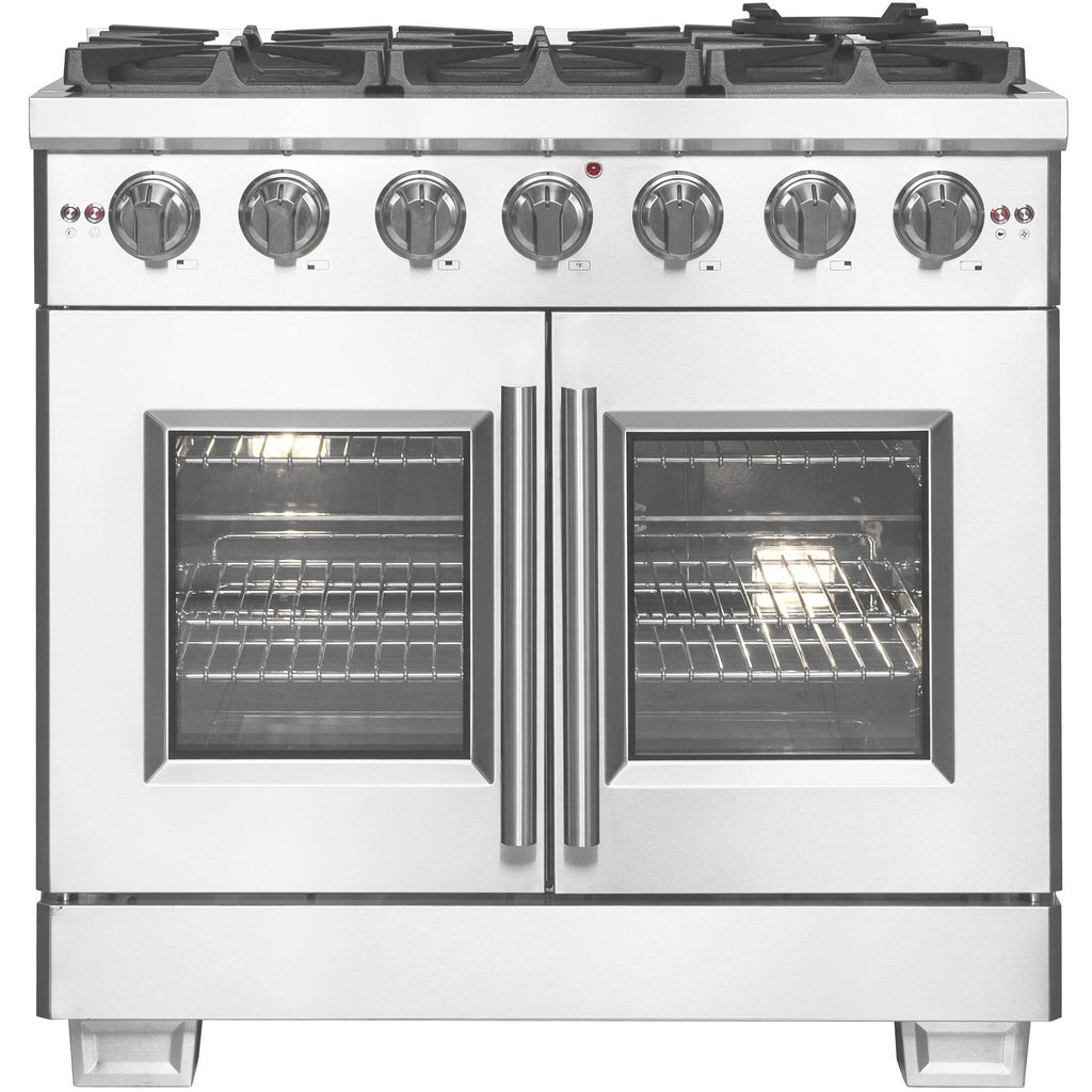 La cuisinière à bicombustible Forno Capriasca, portes française de 36 pouces apporte un style professionnel et des performances dans votre cuisine grâce à sa conception durable en acier inoxydable. Les portes françaises uniques permettent d'obtenir jusqu'à 12 pouces d'espace supplémentaire pour accéder à votre four. La table de cuisson à gaz est équipée de 6 brûleurs en laiton scellés à double anneau, offrant une puissance totale de 120 000 BTU pour mijoter, faire fondre du chocolat ou préparer des sauces. Les grilles en fonte continue robustes offrent une stabilité maximale aux ustensiles de cuisine, tout en gardant les éclaboussures et les déversements contenus dans une cavité en émail encastrée facile à nettoyer. Le four à gaz de 5,36 pieds cubes a une puissance totale de 30 000 BTU et est enveloppé dans un intérieur en émail bleu. De plus, il contient un ventilateur à convection garantissant une cuisson rapide, précise et uniforme. Les portes françaises sont dotées de fenêtre en verre à 3 couches afin de préserver la chaleur, tout en maintenant une visibilité facile. La cuisinière inclu un kit de conversion GPL, 3 grilles de four télescopiques en acier inoxydable, un support pour wok, une plaque réversible, un kit de rôtissoire avec des brochettes et des fourchettes, un panier pour friteuse à air (AirFry), son support et une lèchefrite. De plus, les boutons en métal revêtus de zinc avec anneaux de lunette conserveront leur beauté pendant des années. Tous les produits FORNO sont accompagnés d'une garantie de 2 ans.