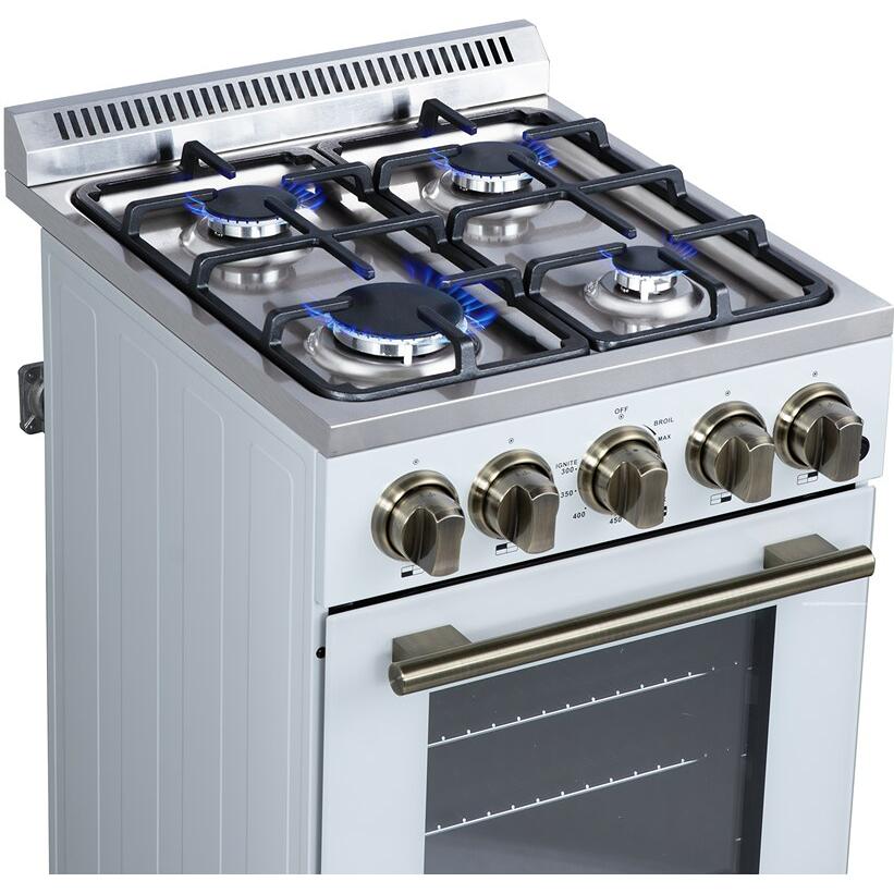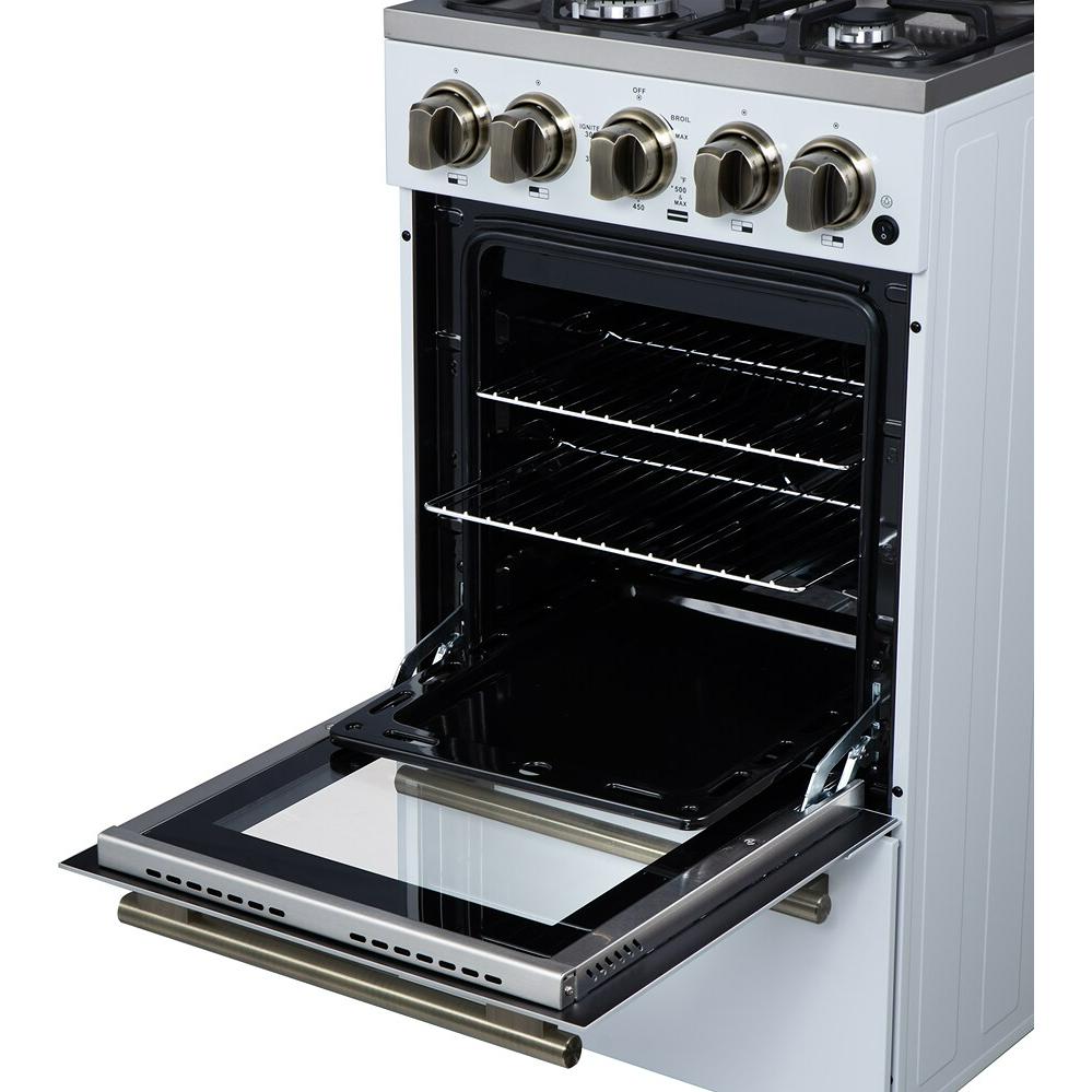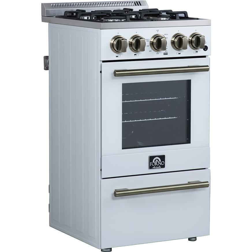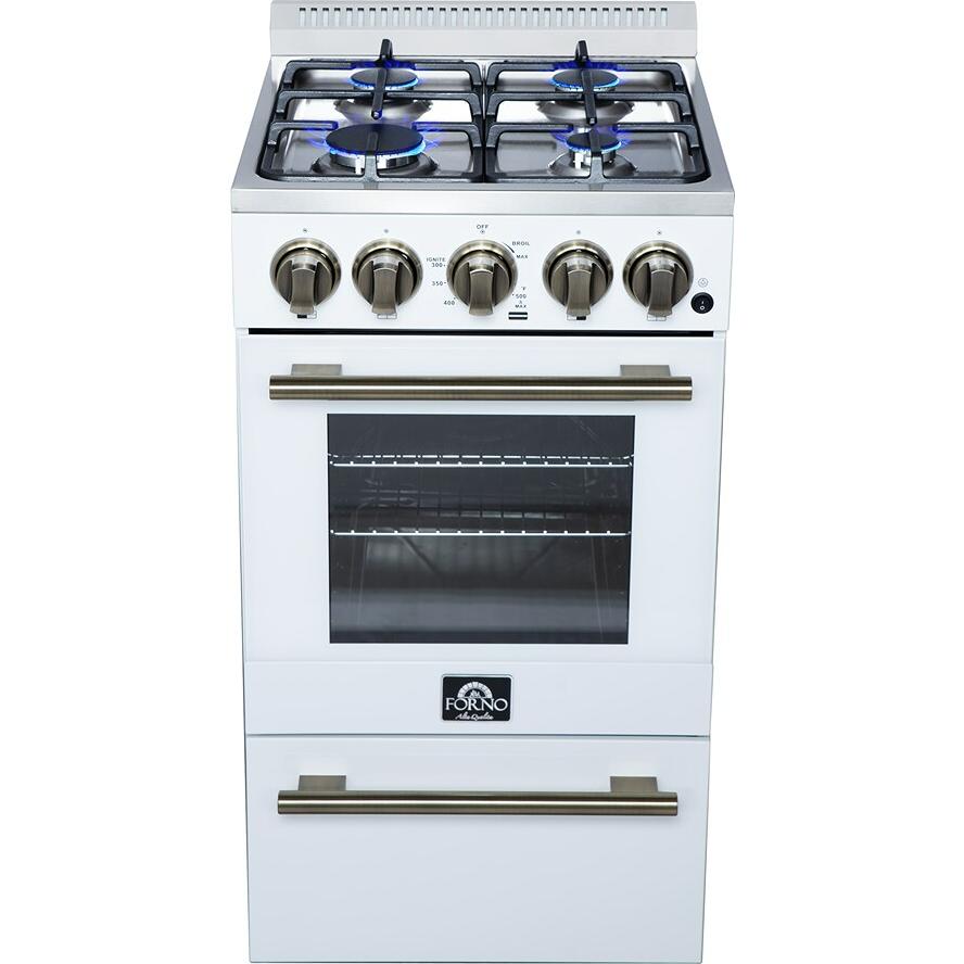 Le Forno 20" Alta Qualita Pro-Style Freestanding Gas Range apporte un style professionnel et des performances de qualité dans votre cuisine avec son design blanc. La surface de cuisson est dotée de 4 brûleurs scellés d'une puissance totale de 21 200 BTU et est équipée de grilles en fonte continue. Le four de 20 pouces a une capacité de 2,05 pieds cubes avec une puissance combinée de cuisson et de grill de 13 000 BTU et un ventilateur de refroidissement interne. La cuisinière inclu deux grilles de four électroplaquées, un kit de conversion LP et un cordon d'alimentation. Assurez une précision dans votre cuisine en utilisant le thermostat et le régulateur de l'appareil. De plus, les boutons en métal revêtus de zinc avec des bagues de finition conserveront leur beauté pendant des années. Tous les produits FORNO sont accompagnés d'une garantie de 2 ans.