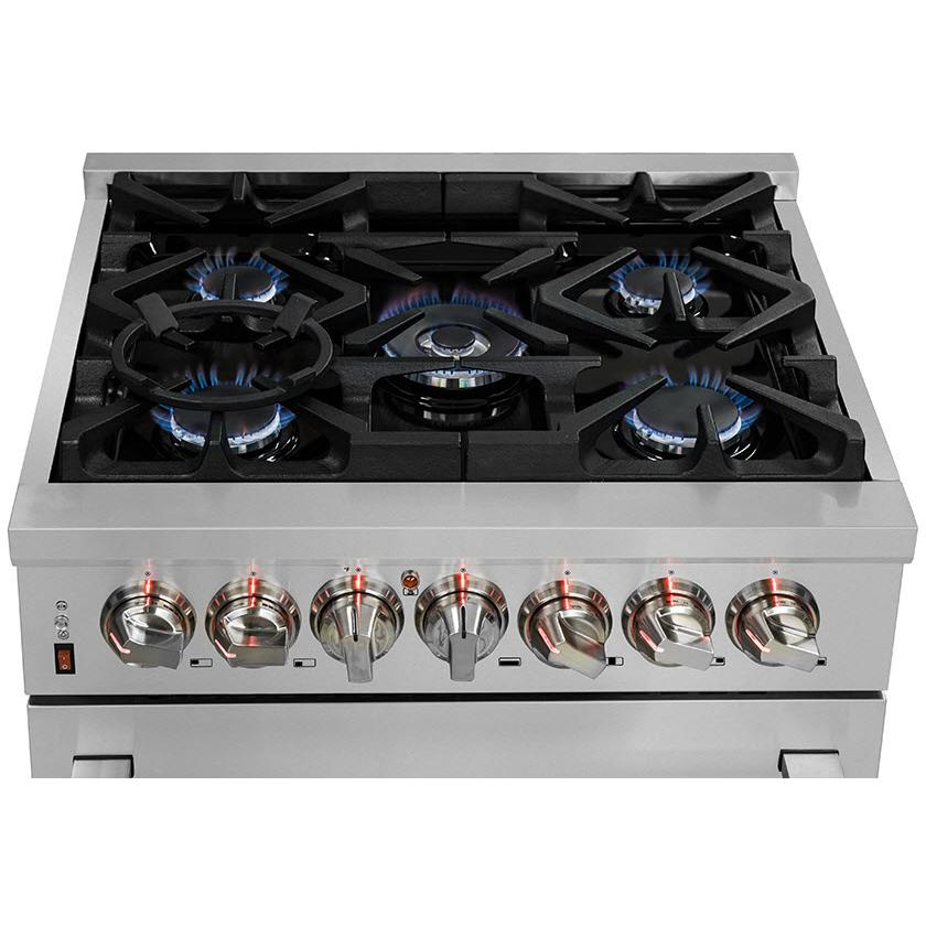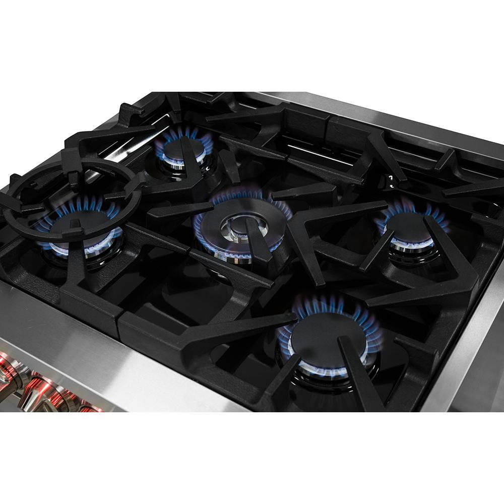 La cuisinière bicombustible Forno de 30 pouces apporte un style professionnel et une qualité supérieure dans votre cuisine grâce à son design durable en acier inoxydable. La table de cuisson est équipée de 5 brûleurs scellés d'une puissance totale de 68 000 BTU, dont 1 brûleur double à anneau scellé pour mijoter délicatement le chocolat fondu ou préparer des sauces, vous offrant la possibilité de cuisiner tous les délicieux repas que vous désirez. Les grilles continues en fonte permettent une stabilité maximale des ustensiles de cuisine sur une cavité encastrée émaillée de la table de cuisson, ce qui garde les déversements et les éclaboussures contenus et facilite le nettoyage.Le four à convection de 4,32 pieds cubes est doté d'un intérieur en émail bleu impressionnant qui facilite le nettoyage. Les fenêtres du four en verre ont 3 couches et permettent une bonne isolation tout en préservant un visibilité facile. Ce four offre également une puissance totale de 6 300 watts, fournissant amplement de puissance pour la cuisson, la rôtisserie et la cuisson au four. Deux grilles de four télescopiques électroplaquées sont inclues avec la cuisinière, un anneau de wok concave et un kit de conversion LP. Logé dans un corps en acier inoxydable de haute qualité et doté de boutons en zinc illuminés, cet appareil présente un look élégant conçu pour durer. Tous les produits Forno sont couverts par une garantie de 2 ans solide pour votre satisfaction. Évitez les prix élevés sans sacrifier la qualité et les performances. Réduisez le coût de la vie avec Forno.