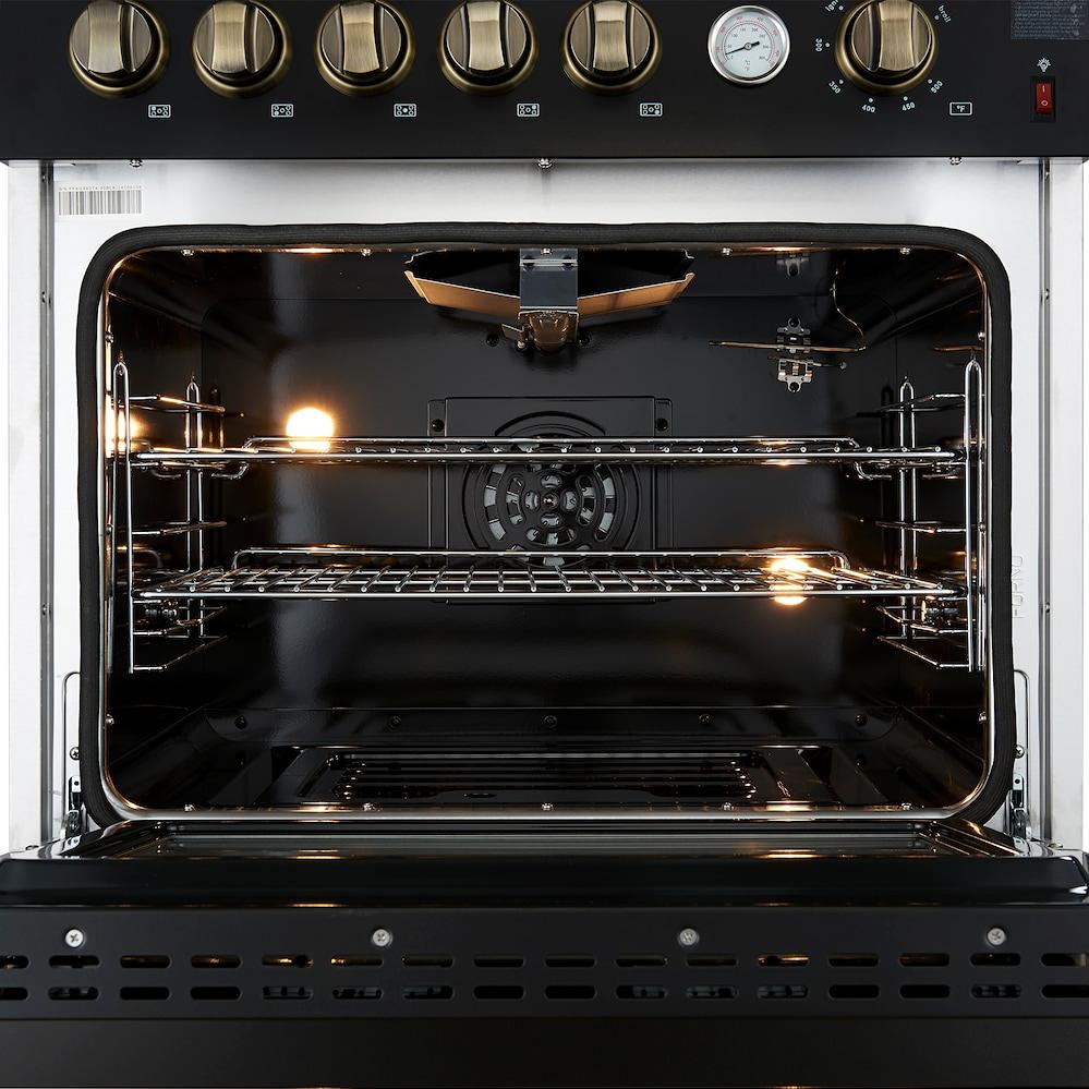 Découvrez l’alliance parfaite du style et de la performance avec la cuisinière au gaz Giovanni 30 po Alta Qualita, offerte en noir audacieux avec des accents en laiton antique. Conçue pour libérer votre créativité culinaire, elle est dotée de 5 brûleurs puissants totalisant 67 000 BTU, dont un brûleur à double anneau polyvalent, idéal autant pour mijoter des sauces que pour saisir des steaks. Le four à convection de 4,32 pi³ assure des résultats impeccables, que ce soit pour des pâtisseries dorées à point ou des plats rôtis savoureux. Avec des accessoires inclus comme un support pour wok et un panier de cuisson à air chaud, cette cuisinière s’adapte à toutes vos envies tout en simplifiant le nettoyage. Offrez élégance et fiabilité à votre cuisine avec la Giovanni. Réduisez le coût de la vie avec Forno.