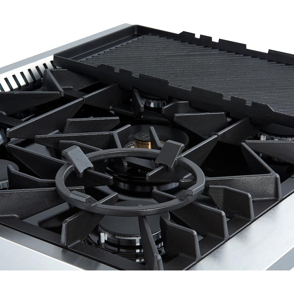 • Les grilles continues en fonte assurent une distribution uniforme de la chaleur et une mobilité stable des ustensiles de cuisine.