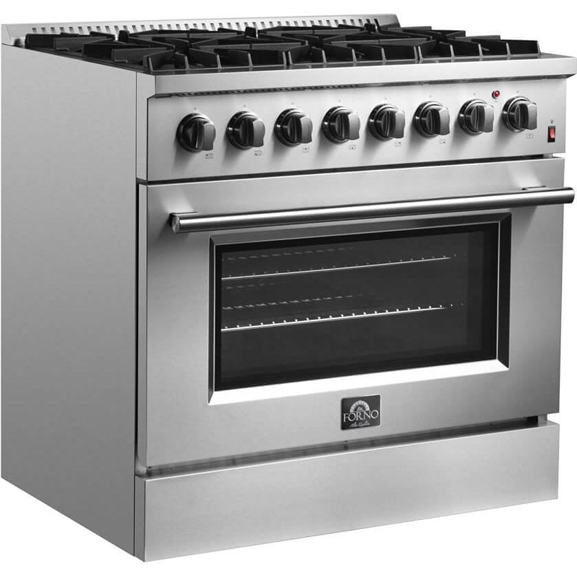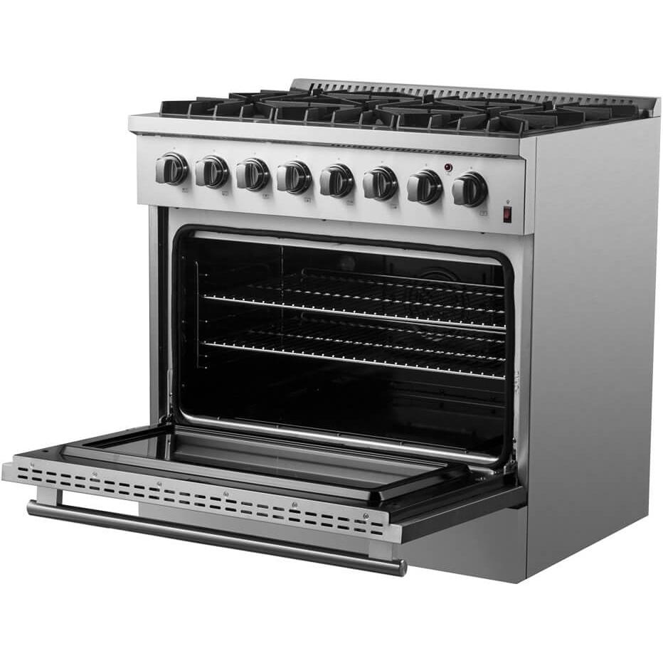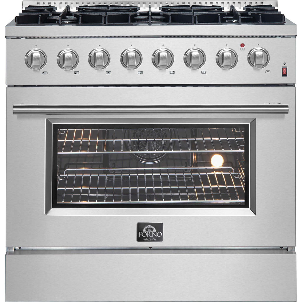 La cuisinière biénergie Forno Marco de 36 po offre un style et des performances dignes des professionnels grâce à son design élégant en acier inoxydable. Avec une puissance totale de 67 000 BTU, sa surface de cuisson dotée de 6 brûleurs scellés permet aussi bien les mijotages doux que les saisies puissantes. Les grilles continues en fonte facilitent le déplacement des casseroles. Le spacieux four à convection véritable de 5,36 pi³ est équipé d’un élément de convection de 1500 W et d’un ventilateur pour une cuisson précise et uniforme, tandis que le gril à double élément assure un brunissage parfait. Son intérieur en émail noir et ses lumières halogènes améliorent la visibilité et simplifient le nettoyage. Un brûleur de cuisson dissimulé empêche les déversements et les odeurs, rendant l’appareil encore plus pratique. Il est livré avec un cordon d’alimentation NEMA 14-50P et un régulateur de gaz de 1/2 po pour une installation facile. Compatible avec le gaz naturel et le propane (trousse de conversion incluse), cette cuisinière allie durabilité, sophistication et flexibilité culinaire. Réduisez le coût de la vie avec Forno.