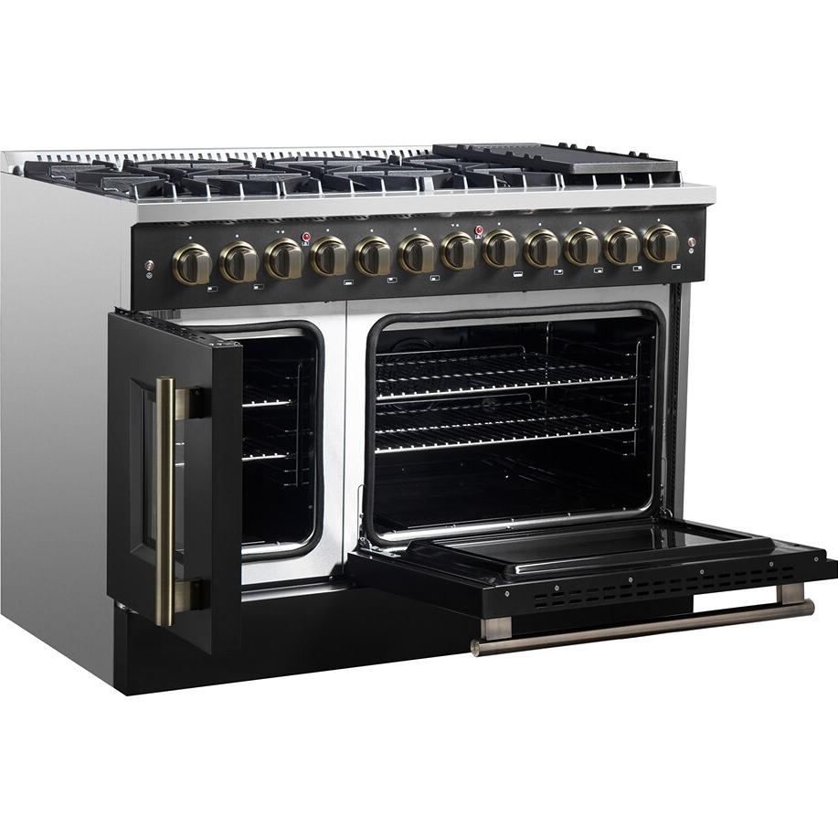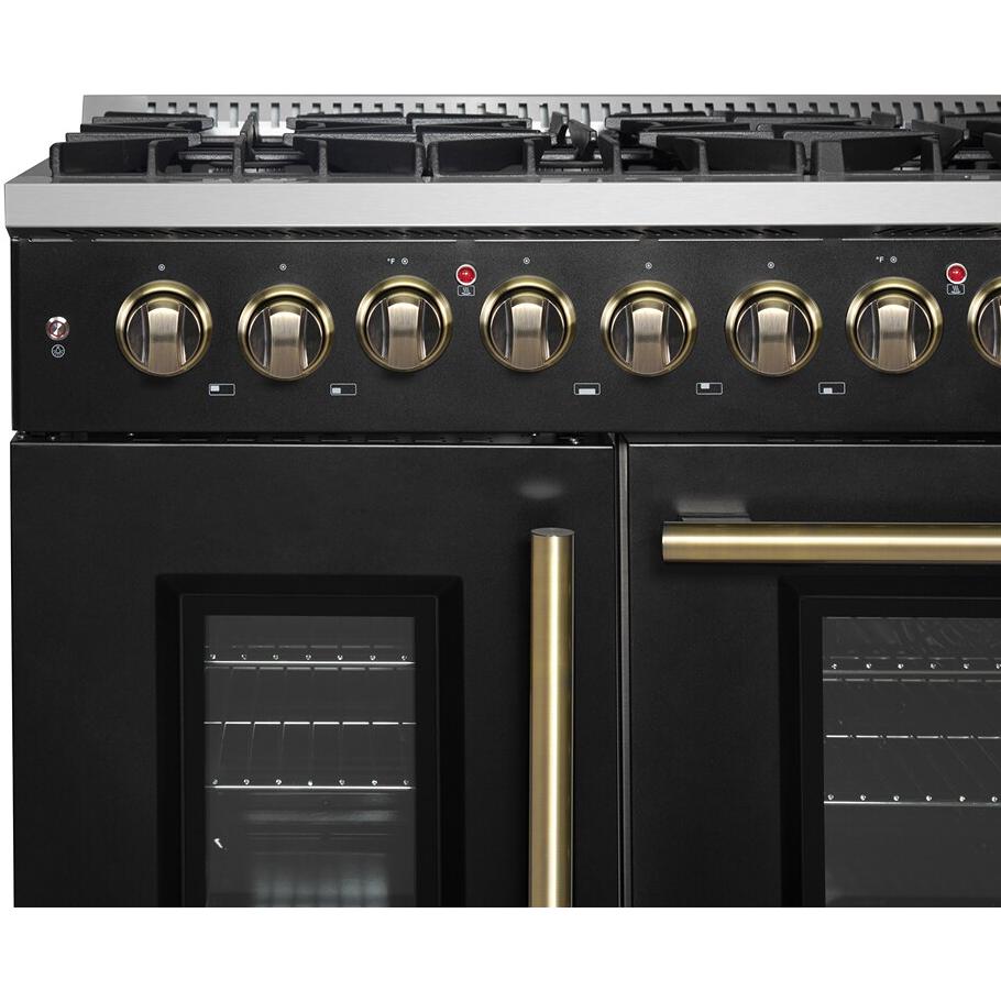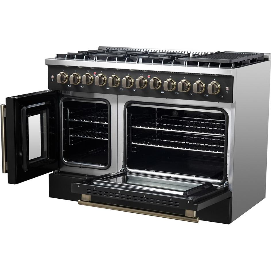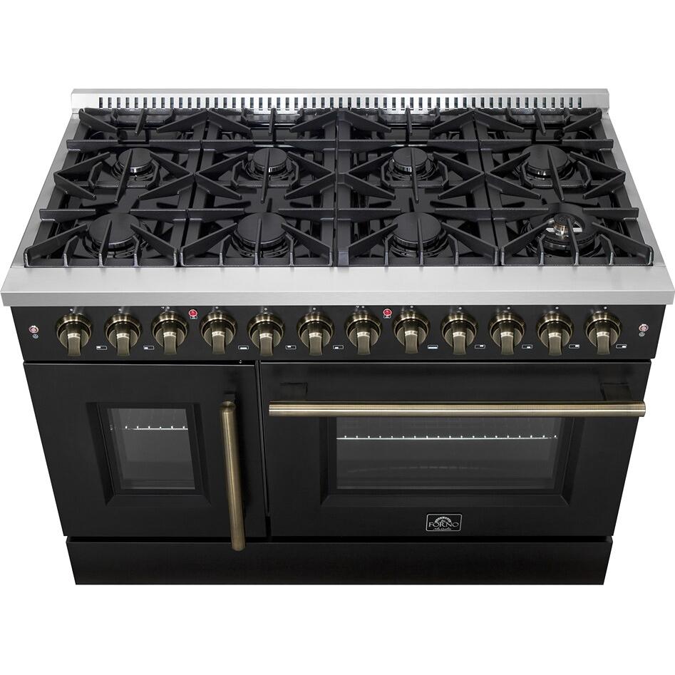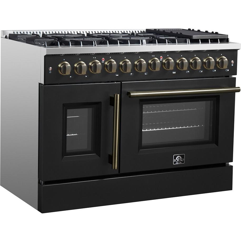 La cuisinière à gaz Forno Galiano avec portes françaises de 48 pouces apporte une esthétique et une experience professionnelle dans votre cuisine grâce à sa conception durable. La surface de cuisson comprend 8 brûleurs scellés avec une puissance totale de 107 000 BTU, dont 1 brûleur scellé à double anneau pour mijoter, faire fondre le chocolat ou préparer des sauces. Les grilles continues en fonte offrent une stabilité maximale aux ustensiles de cuisine et permettent un déplacement facile des casseroles et des poêles sur la surface de cuisson en émail encastrée, qui garde les déversements et les éclaboussures contenus et facilite le nettoyage. Les fours électriques doubles ont une capacité totale combinée de 6,58 pieds cubes, avec une puissance totale de 9 700 watts, et sont enveloppés dans des intérieurs en émail bleu et des fenêtres de porte de four en verre trempé à 3 couches. Le four de droite est doté d'une fonction a convection afin d'accélérer le processus de cuisson. Un kit de conversion au GPL, 4 grilles de four électro-plaquées, un anneau de wok et une grille/réversible de grill sont inclus. De plus, les boutons en métal revêtus de zinc avec bagues de finition conservent leur beauté pendant des années.