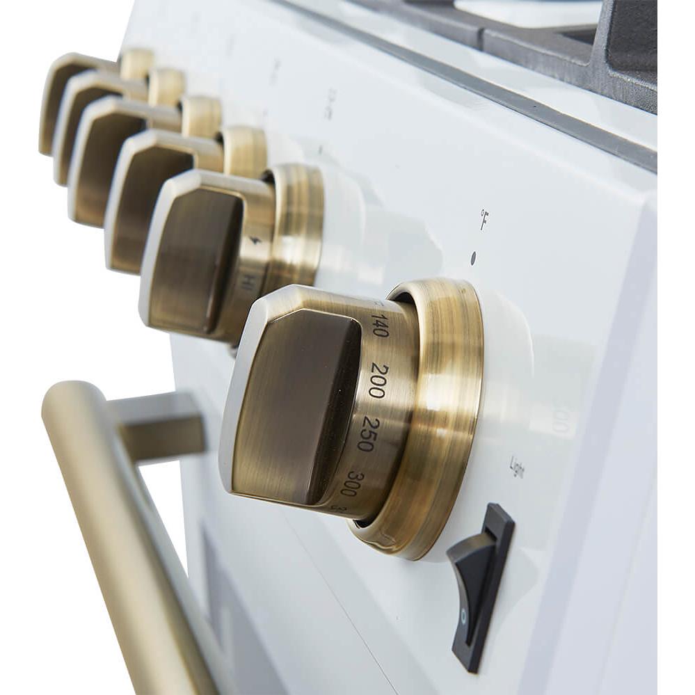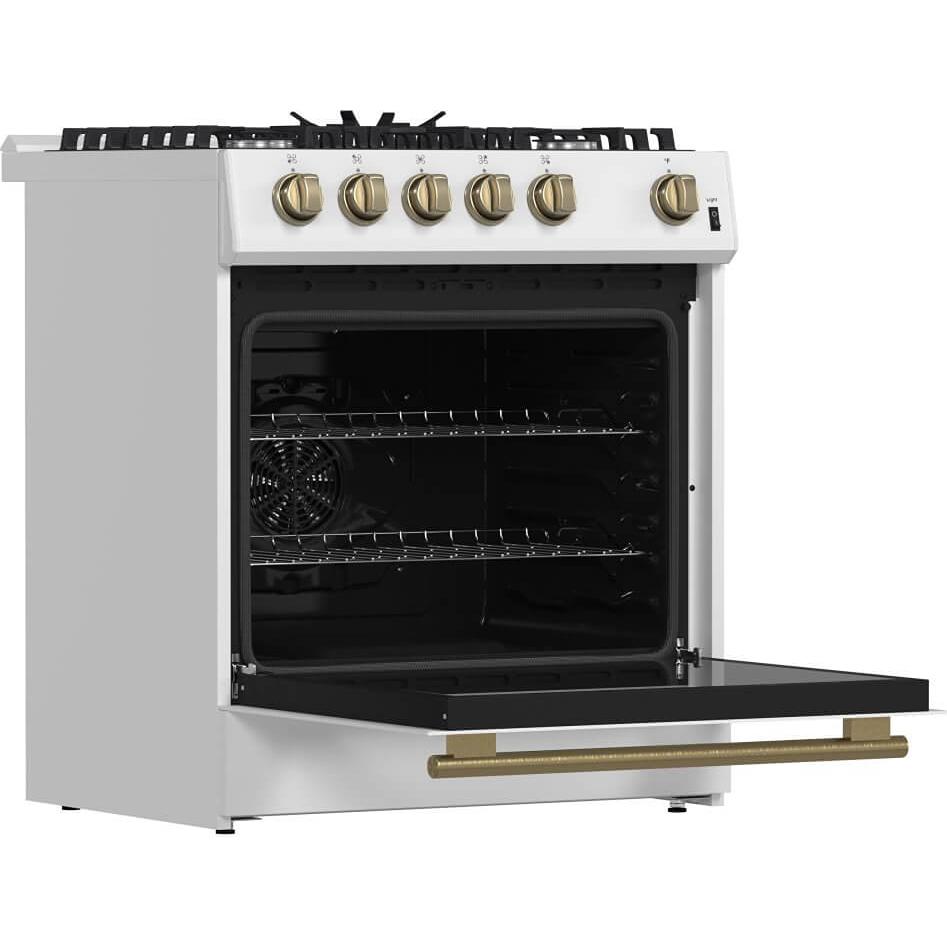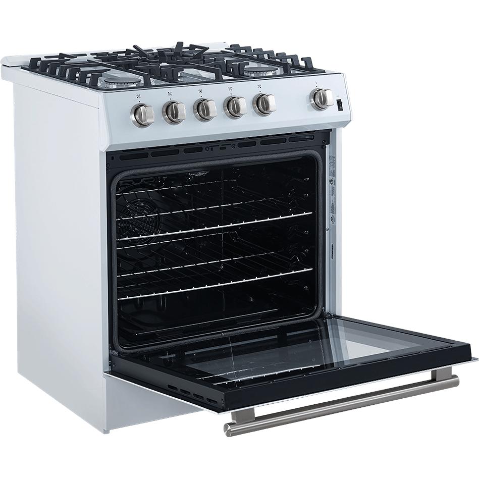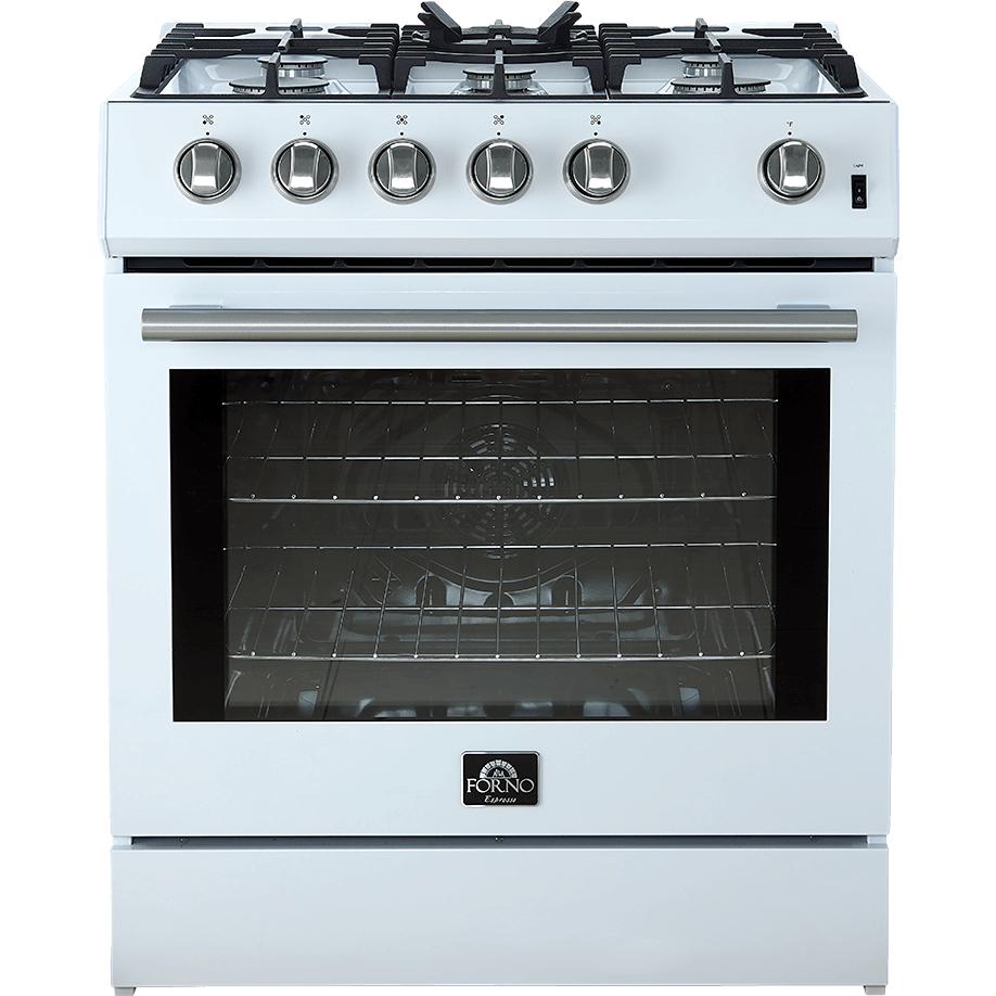 La cuisinière à gaz Forno Leonardo de 30 po en blanc allie design moderne et performance de niveau professionnel. Sa surface de cuisson puissante offre une puissance totale de 39 500 BTU répartie sur des grilles continues en fonte, assurant stabilité et déplacement fluide des casseroles. La surface émaillée noire en retrait facilite le nettoyage en contenant les éclaboussures. Le spacieux four à convection de 5,0 pi³ fournit une puissance de cuisson et de grillage de 22 500 BTU, avec deux hauteurs de grilles réglables et un puissant ventilateur de convection pour une distribution uniforme de la chaleur. Conçue pour offrir une fiabilité optimale, la fonction de rallumage automatique garantit des performances constantes, tandis que la compatibilité avec le gaz naturel et le kit de conversion au propane inclus assurent une installation flexible.