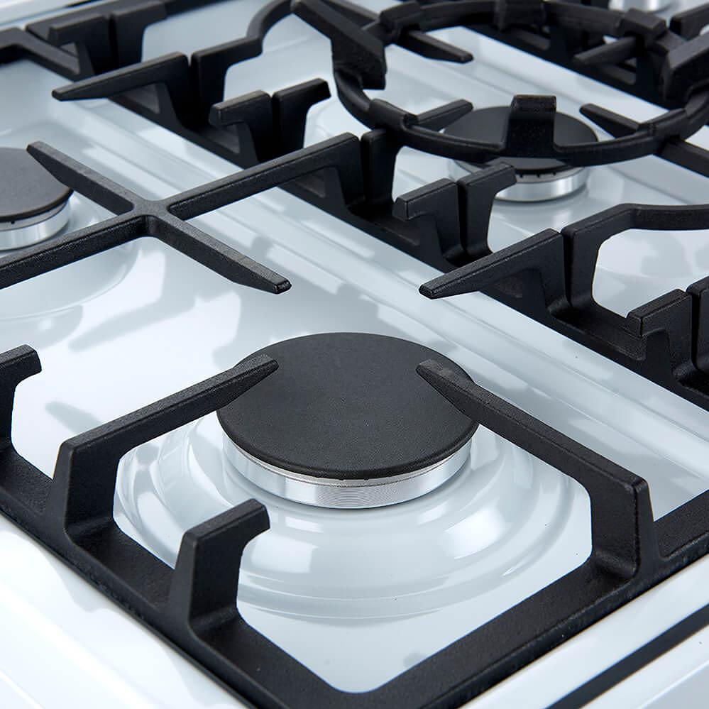 • Les grilles continues en fonte assurent la stabilité et la mobilité des ustensiles de cuisine, à la fois sur et hors de la source de chaleur.