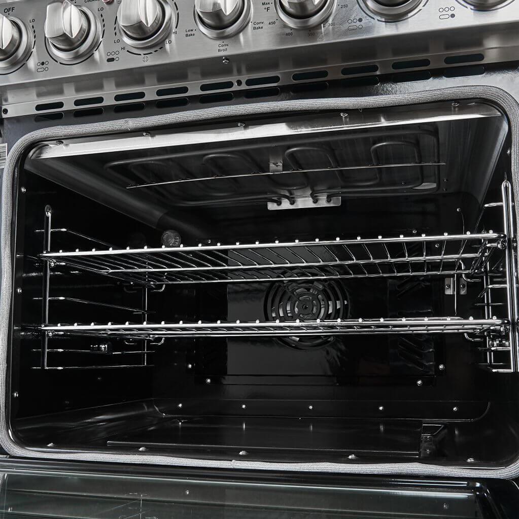 • Le four en émail noir de 4,38 pi³ est doté d'une véritable convection avec un élément de 1 200 watts, fournissant une chaleur constante pour une cuisson uniforme, et une puissance totale de cuisson et de gril de 3 800 watts.