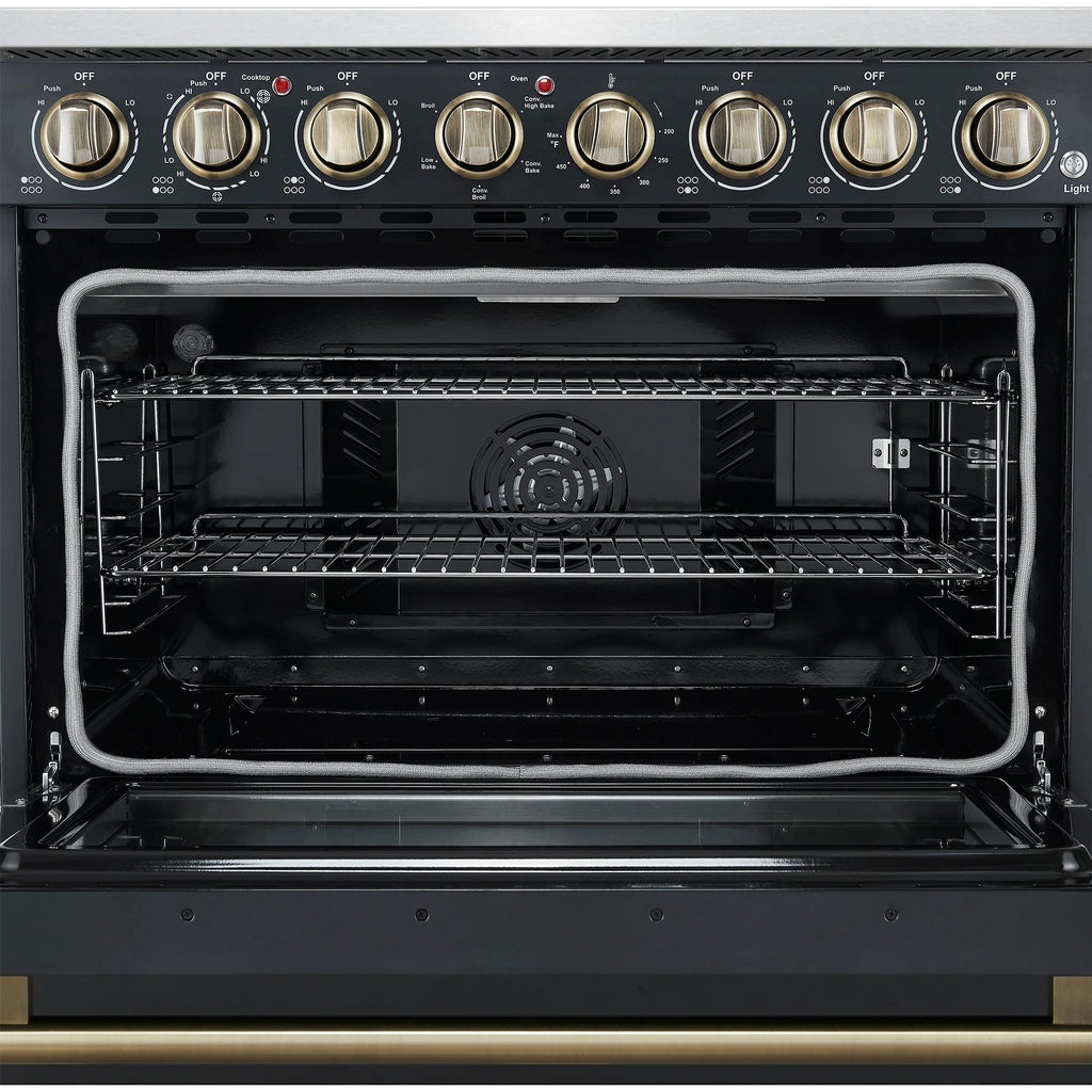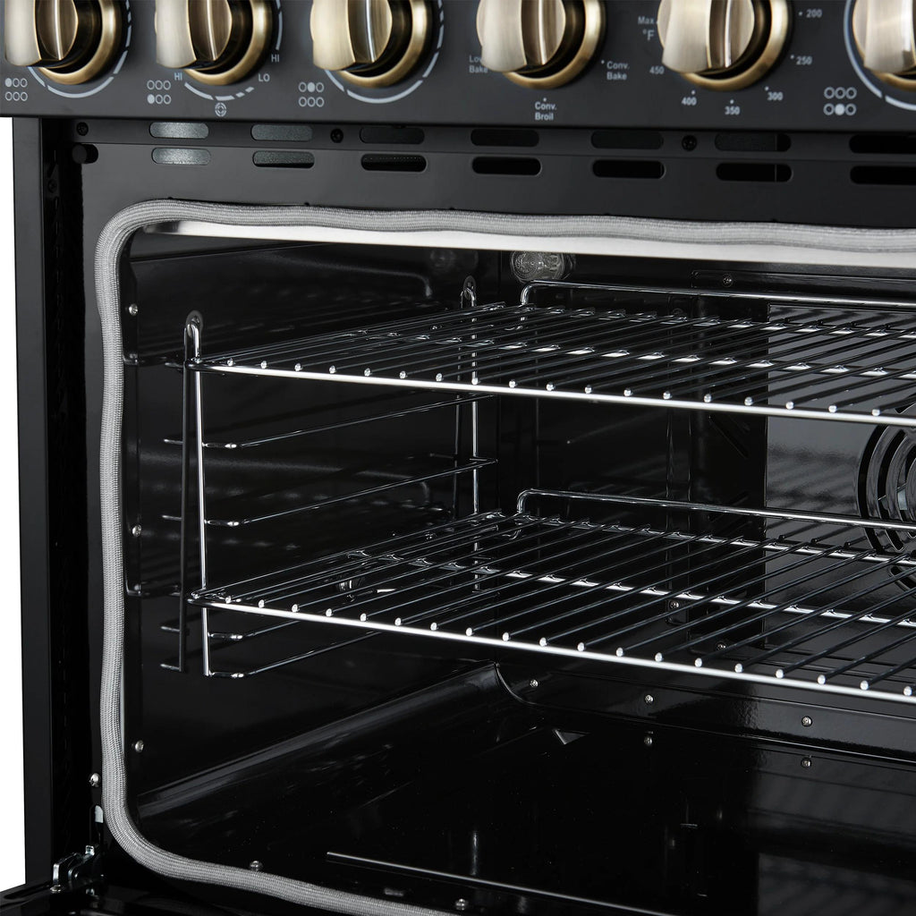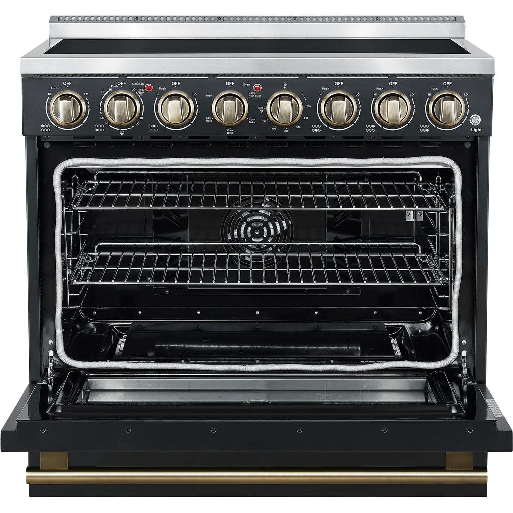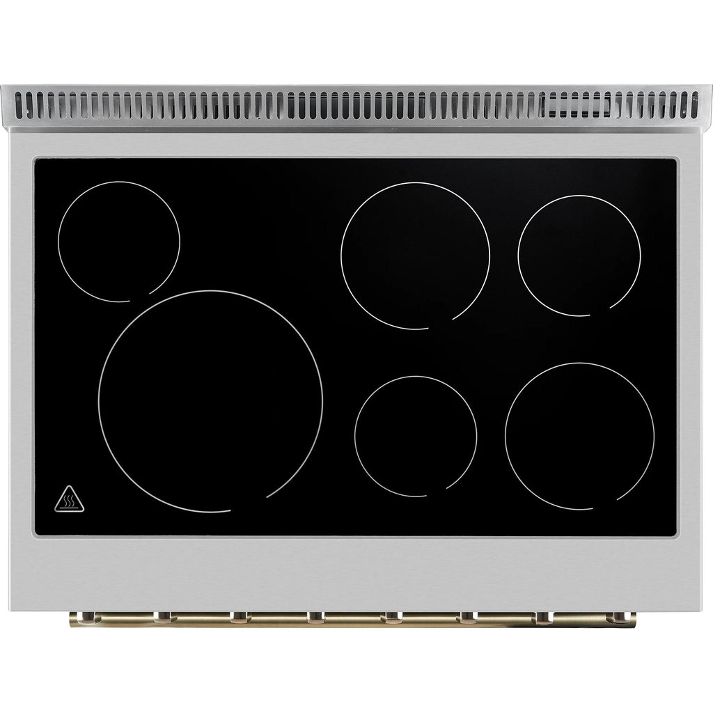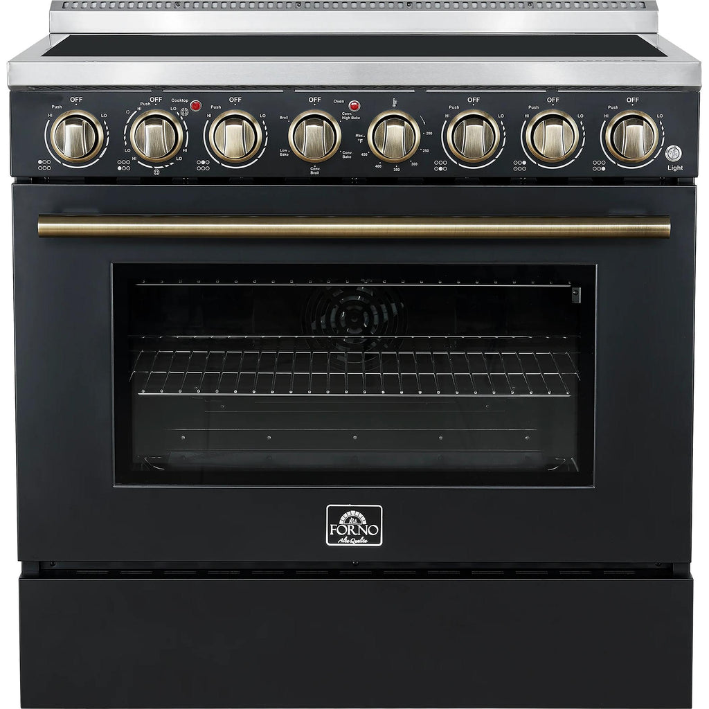 La cuisinière électrique Forno Paolo de 36 po en noir allie puissance et style pour la cuisine moderne. Sa surface de cuisson en vitrocéramique lisse comprend cinq éléments radiants totalisant 9 800 watts. Le four à convection véritable de 5,44 pi³ offre des résultats rapides et uniformes grâce à un ventilateur de 1 200 watts et à des éléments de cuisson et de grillage haute performance de 3 000 watts. Un élément dissimulé, un éclairage halogène lumineux et une grande fenêtre de visualisation ajoutent à la praticité. Cette cuisinière autoportante est également dotée d’une zone de maintien au chaud de 100 watts et d’un gril double pour une cuisson précise à haute température.