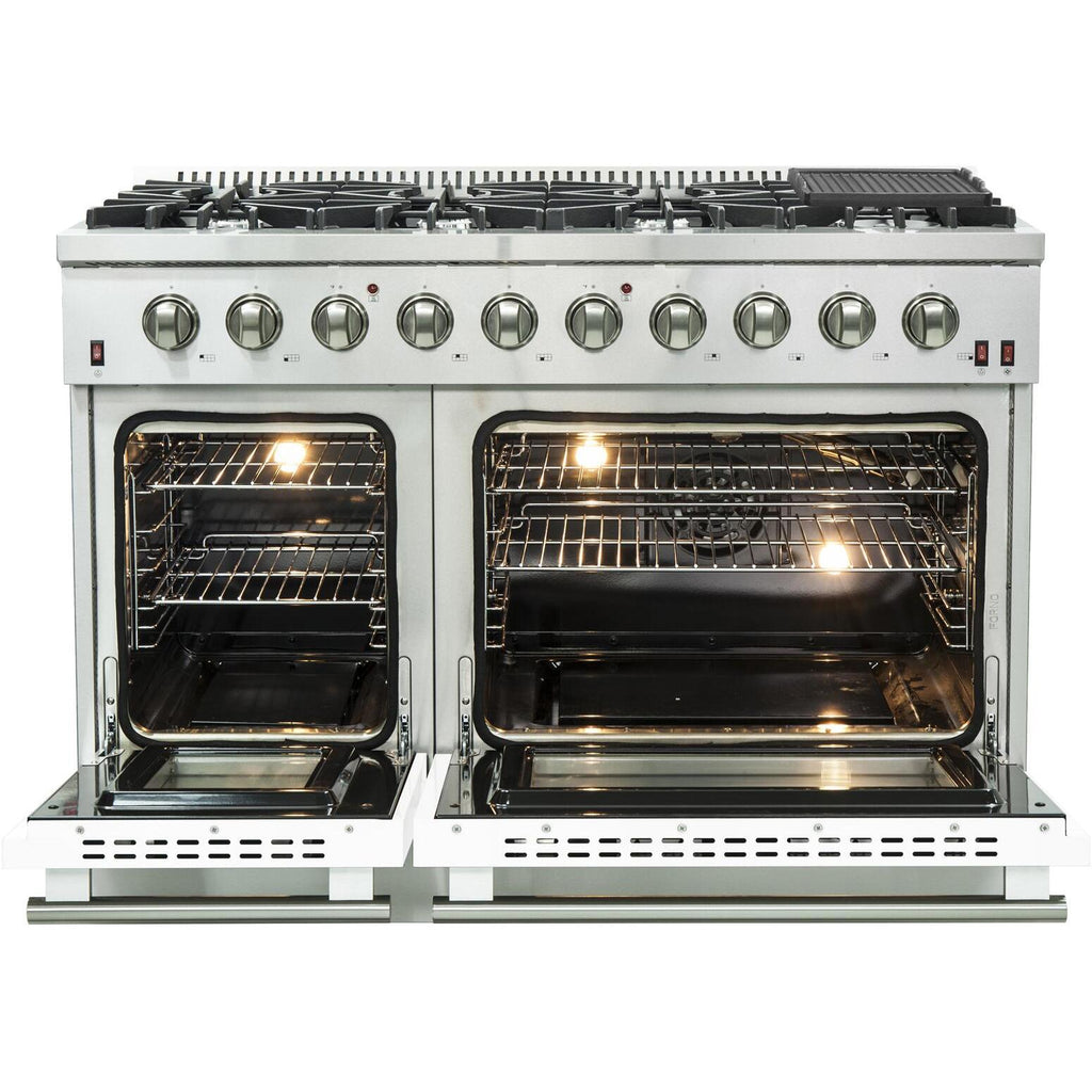 La cuisinière à gaz Forno Galiano de 48 pouces apporte un style et des performances professionnelles dans votre cuisine grâce à sa conception en acier inoxydable durable. La surface de cuisson comprend 8 brûleurs scellés avec une puissance totale de 107 000 BTU, dont 1 puissant brûleur scellé à double anneau pour l'ébullition ou la saisie, capable de réaliser des mijotages parfait pour les sauces, ou faire fondre du chocolat. Les grilles en fonte continue assurent une stabilité maximale des ustensiles de cuisine et permettent de faire glisser facilement les poêles d'un brûleur chaud. La surface de cuisson émaillée encastrée et scellée garde les déversements et les éclaboussures contenus et facilite le nettoyage. Les portes des fours sont équipées de fenêtres en verre trempé à 3 couches pour permettre une visualisation en toute sécurité. Le four de droite est doté d'une fonction de ventilation à convection pour une cuisson ou une rôtisserie de qualité supérieure. Toutes les cuisinières à gaz FORNO incluent un kit de conversion pour gaz propane. Le modèle Galiano de 48 pouces est livré avec une grille/rôtissoire réversible en fonte robuste, 4 grilles de four et un kit de conversion pour gaz propane. De plus, les boutons en métal revêtus de zinc avec des anneaux de bordure conserveront leur beauté pendant des années. Tous les produits FORNO sont accompagnés d'une garantie de 2 ans.