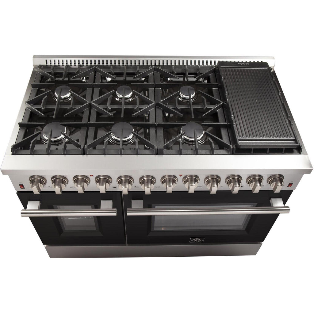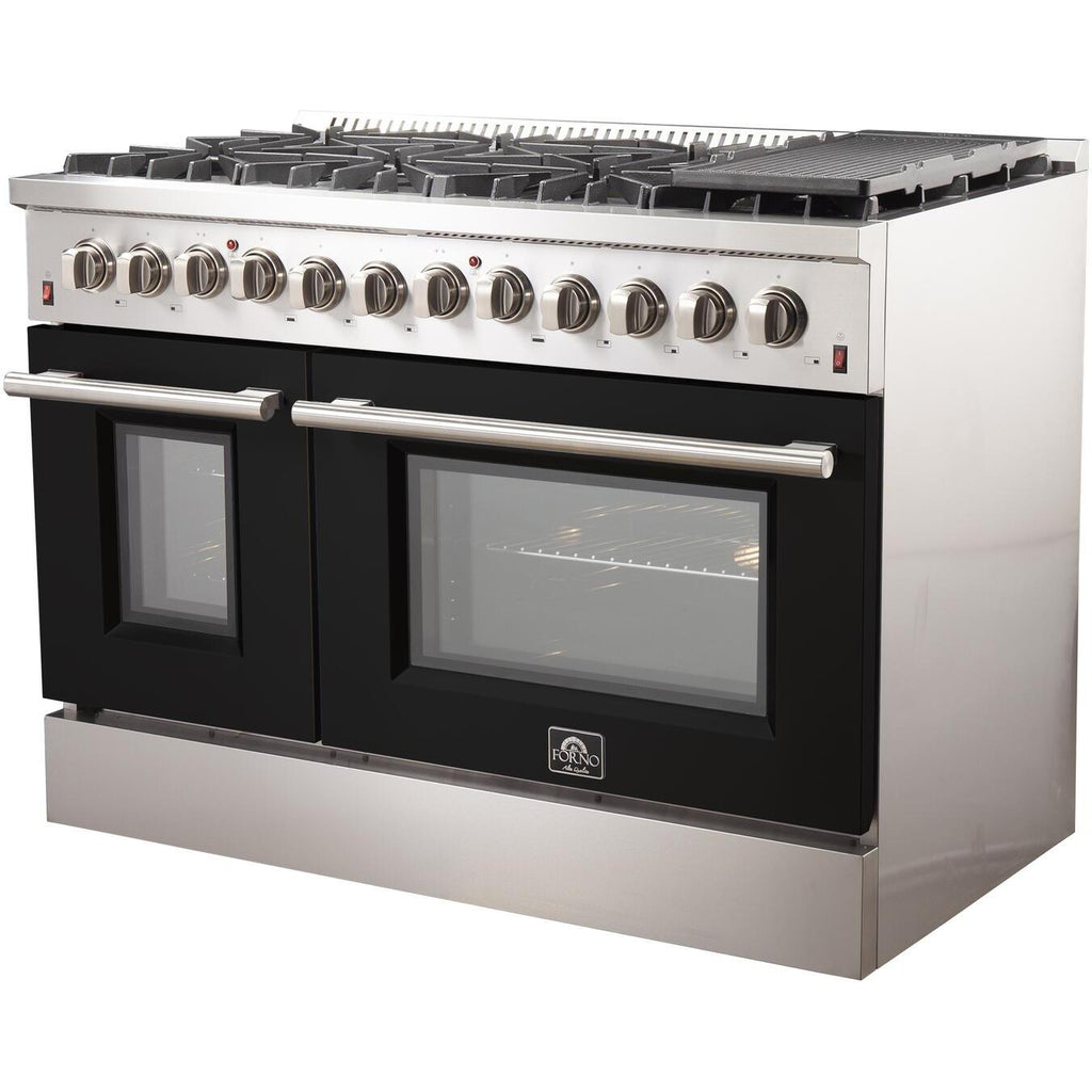 La cuisinière Galiano Dual Fuel de 48 pouces apporte un style et des performances professionnelles dans votre cuisine grâce à sa conception durable en acier inoxydable. La surface de cuisson comprend 8 brûleurs scellés avec une puissance totale de 107 000 BTU. Elle comprend un puissant brûleur à double anneau de 20 000 BTU pour l'ébullition ou la saisie, parfait pour les sauces, ou faire fondre du chocolat. Les grilles continues en fonte offrent une stabilité maximale pour les ustensiles de cuisine et permettent de déplacer facilement les casseroles chaudes. Le four à gaz d'une capacité de 5,26 pieds cubes a une puissance totale de 44 000 BTU pour la cuisson au gril et au four, avec la possibilité d'utiliser la cuisson à convection véritable, le gril ou la rôtisserie. Deux grilles de four et un kit de conversion pour le gaz propane sont inclus. De plus, les boutons en métal revêtus de zinc conservent leur beauté pendant des années. Tous les produits FORNO sont accompagnés d'une garantie de 2 ans.