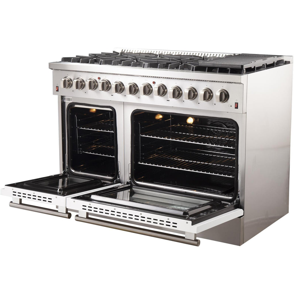 La cuisinière Galiano Dual Fuel de 48 pouces apporte un style et des performances professionnelles dans votre cuisine grâce à sa conception durable en acier inoxydable. La surface de cuisson comprend 8 brûleurs scellés avec une puissance totale de 107 000 BTU. Elle comprend un puissant brûleur à double anneau de 20 000 BTU pour l'ébullition ou la saisie, parfait pour les sauces, ou faire fondre du chocolat. Les grilles continues en fonte offrent une stabilité maximale pour les ustensiles de cuisine et permettent de déplacer facilement les casseroles chaudes. Le four à gaz d'une capacité de 5,26 pieds cubes a une puissance totale de 44 000 BTU pour la cuisson au gril et au four, avec la possibilité d'utiliser la cuisson à convection véritable, le gril ou la rôtisserie. Deux grilles de four et un kit de conversion pour le gaz propane sont inclus. De plus, les boutons en métal revêtus de zinc conservent leur beauté pendant des années. Tous les produits FORNO sont accompagnés d'une garantie de 2 ans.