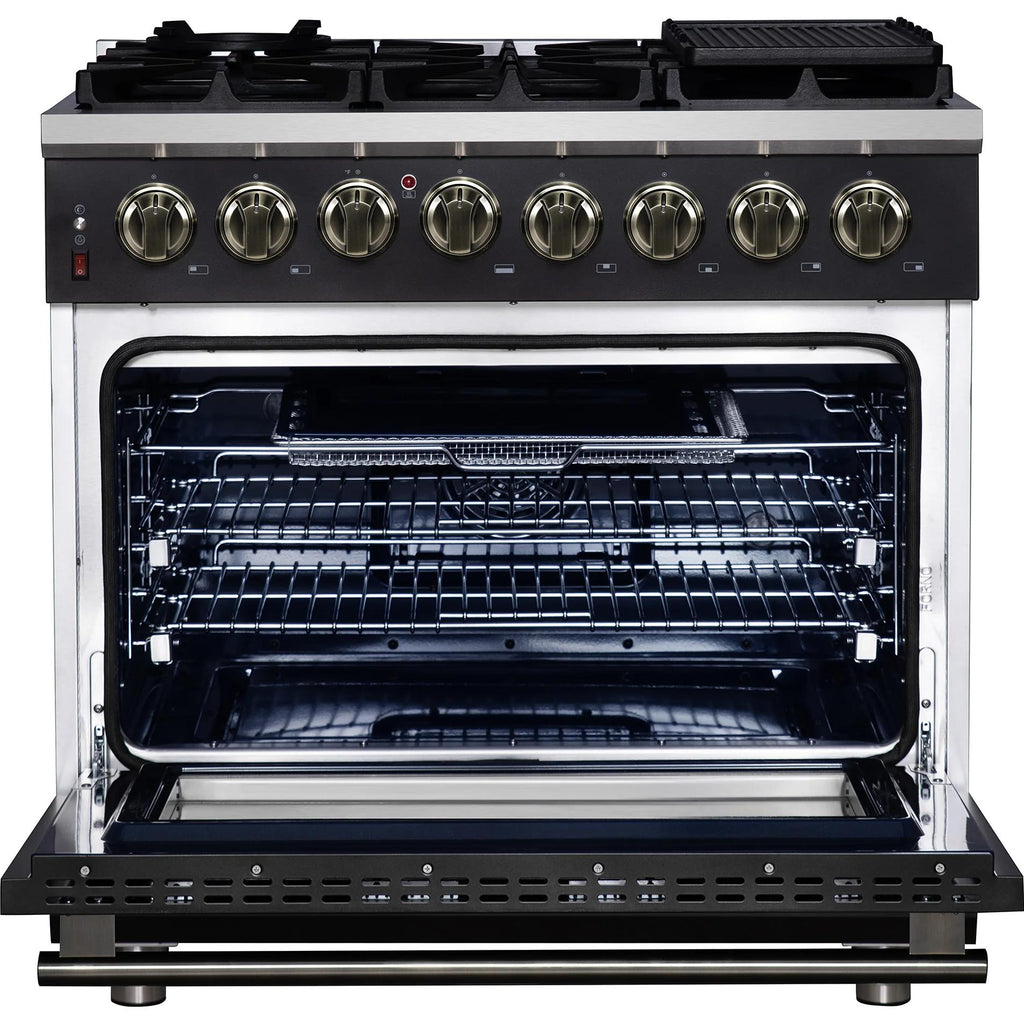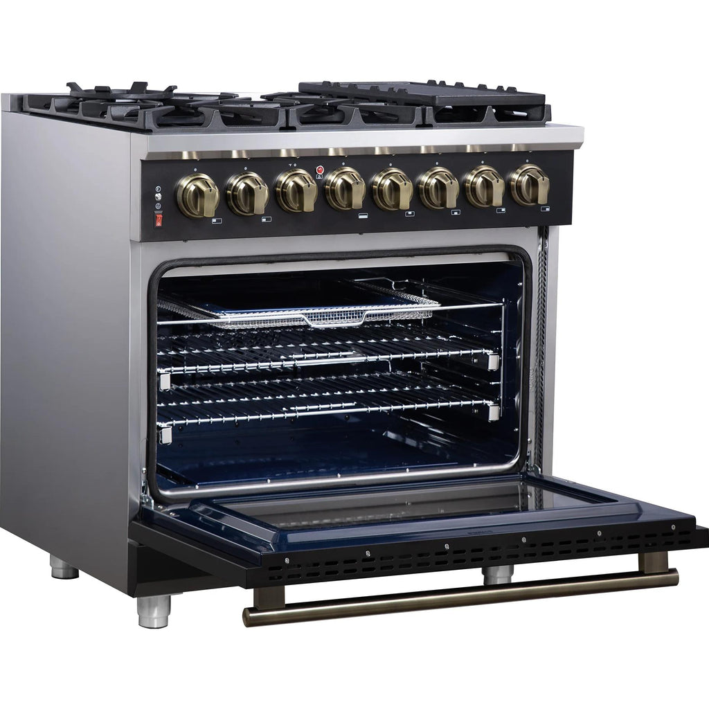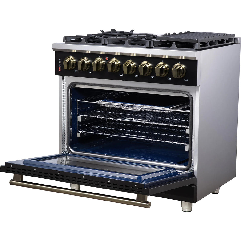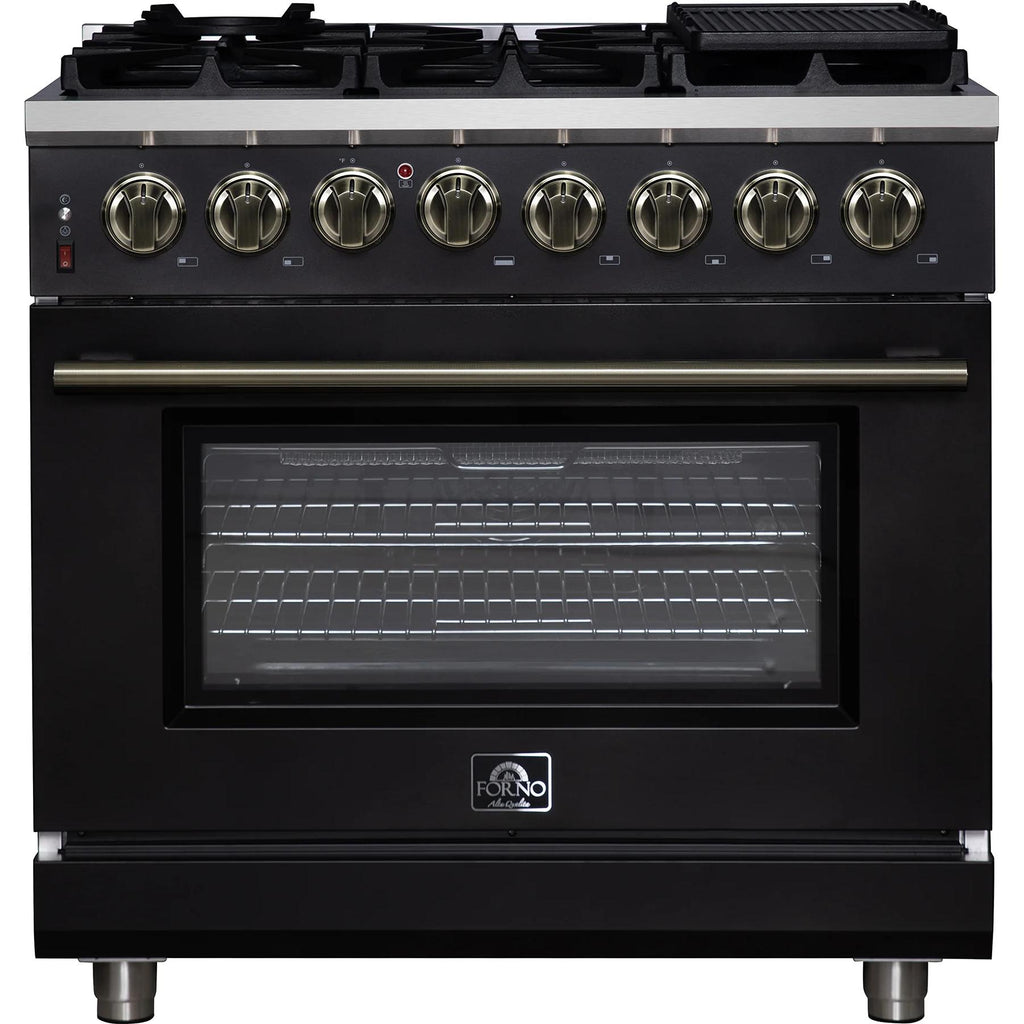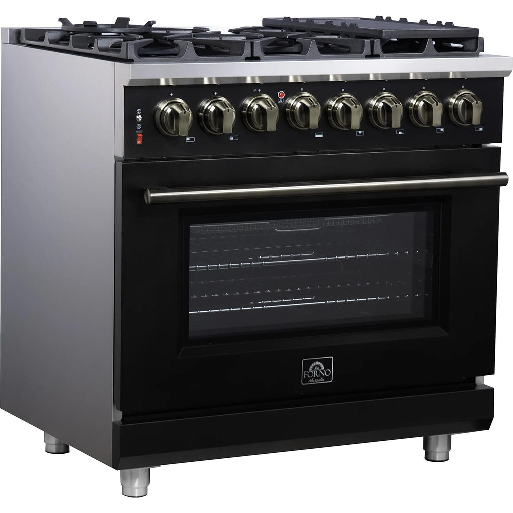 Le Forno bicombulstible de 36 pouces apporte un style et une expérience professionnel dans votre cuisine grâce à sa conception durable noire. La surface de cuisson est équipée de 6 brûleurs scellés d'une puissance totale de 83 000 BTU, dont 1 brûleur double à anneau scellé pour mijoter délicatement le chocolat fondu ou préparer des sauces, et un brûleur double de 20 000 BTU pour faire bouillir ou saisir, capable de réaliser des mijotages comme la fonte de chocolat ou de sauces. Les grilles en fonte continue offrent une stabilité maximale des ustensiles de cuisine sur une cavité de surface de cuisson en émail encastrée, ce qui permet de contenir les éclaboussures et les déversements et facilite le nettoyage. Ce four à convection véritable d'une capacité de 5,36 pieds cubes dispose d'un intérieur en émail bleu ce qui permet un nettoyage facile. La fenêtre du hublot du four en verre à 3 couches assure à la fois une rétention de chaleur et une vue dégagée. Ce four offre également une puissance totale de 6 300 watts, fournissant amplement de puissance pour la cuisson, la rôtisserie et la cuisson au four. Sont inclus 2 grilles de four entièrement télescopiques en acier inoxydable, un anneau de wok concave et un kit de conversion LP. De plus, les boutons en métal revêtus de zinc avec des bagues en biseau conserveront leur beauté pendant des années. La série 6125 est distribuée en quantité limitée. Tous les produits FORNO sont accompagnés d'une garantie de 2 ans.