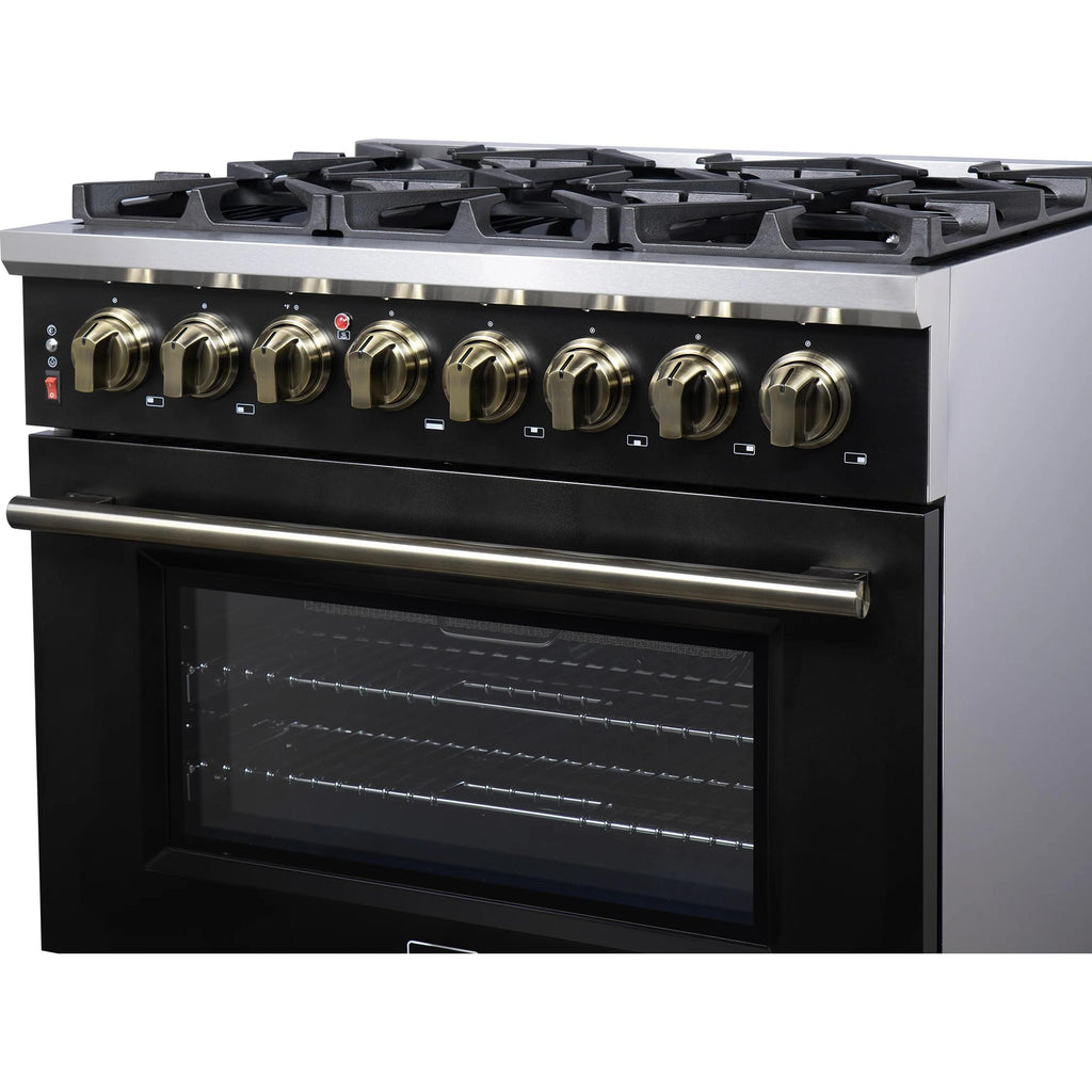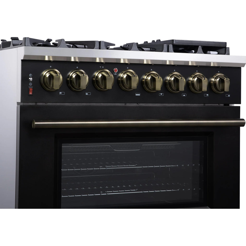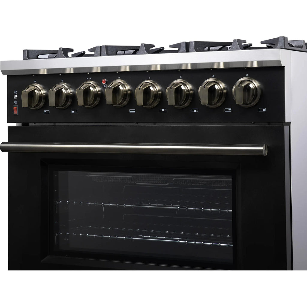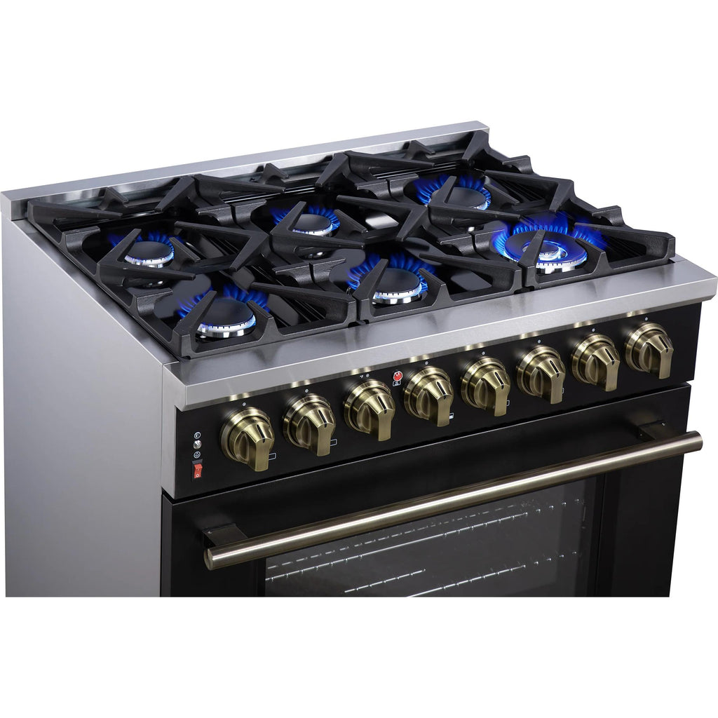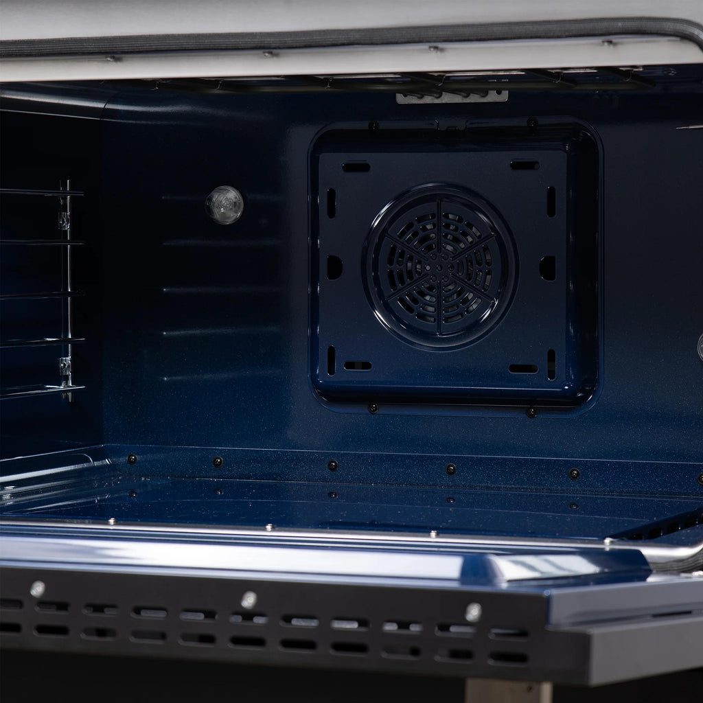 Le Forno bicombulstible de 36 pouces apporte un style et une expérience professionnel dans votre cuisine grâce à sa conception durable noire. La surface de cuisson est équipée de 6 brûleurs scellés d'une puissance totale de 83 000 BTU, dont 1 brûleur double à anneau scellé pour mijoter délicatement le chocolat fondu ou préparer des sauces, et un brûleur double de 20 000 BTU pour faire bouillir ou saisir, capable de réaliser des mijotages comme la fonte de chocolat ou de sauces. Les grilles en fonte continue offrent une stabilité maximale des ustensiles de cuisine sur une cavité de surface de cuisson en émail encastrée, ce qui permet de contenir les éclaboussures et les déversements et facilite le nettoyage. Ce four à convection véritable d'une capacité de 5,36 pieds cubes dispose d'un intérieur en émail bleu ce qui permet un nettoyage facile. La fenêtre du hublot du four en verre à 3 couches assure à la fois une rétention de chaleur et une vue dégagée. Ce four offre également une puissance totale de 6 300 watts, fournissant amplement de puissance pour la cuisson, la rôtisserie et la cuisson au four. Sont inclus 2 grilles de four entièrement télescopiques en acier inoxydable, un anneau de wok concave et un kit de conversion LP. De plus, les boutons en métal revêtus de zinc avec des bagues en biseau conserveront leur beauté pendant des années. La série 6125 est distribuée en quantité limitée. Tous les produits FORNO sont accompagnés d'une garantie de 2 ans.