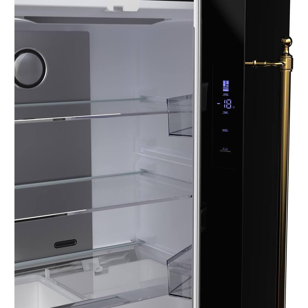 Affichez un style audacieux dans votre cuisine avec notre réfrigérateur sans givre de 18 pi³, au fini noir élégant rehaussé de poignées en laiton antique pour une touche sophistiquée. Offrant un compartiment réfrigérateur spacieux de 12 pi³ et un congélateur de 6 pi³, ce modèle propose des solutions de rangement flexibles grâce à ses tablettes en verre ajustables, ses balconnets de porte et ses bacs à légumes.