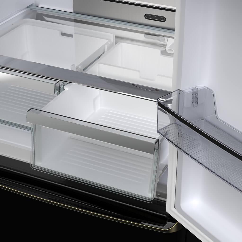 • Le compartiment pour aliments frais offre 3 tablettes en verre, 4 bacs de porte spacieux et 2 bacs à légumes pour un rangement organisé et flexible.
