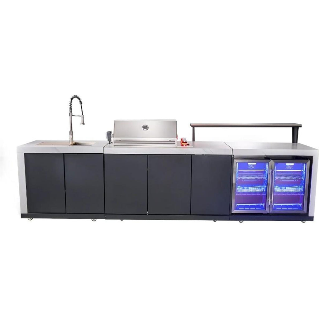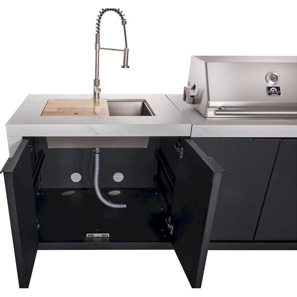 Transformez votre cour arrière avec la cuisine extérieure Forno Rimini, conçue pour allier style et performance. Elle comprend un BBQ de 30" avec une surface de cuisson de 26" x 18", trois brûleurs en acier inoxydable de 12 000 BTU chacun, un brûleur infrarouge pour saisie de 13 000 BTU, et un brûleur de rôtissoire de 13 600 BTU. Ses grilles en acier inoxydable de 8 mm assurent une durabilité exceptionnelle, tandis que le capot à double paroi, le thermomètre intégré et l’allumage Piezo offrent une cuisson précise. Deux lumières halogènes, un bac à graisse facile d’accès et une armoire de rangement spacieuse ajoutent à la commodité. Les élégants comptoirs en pierre frittée blanche rehaussent l’esthétique de l’ensemble. Comprend un centre de boissons de 4,8 pi³ avec deux réfrigérateurs pour un rangement optimal de vos breuvages, ainsi qu’une poubelle télescopique pratique. Prête pour le propane et convertible au gaz naturel, elle est livrée avec un kit de rôtissoire et un moteur électrique. Livrée entièrement assemblée avec une housse imperméable, la Rimini est la solution ultime pour cuisiner en plein air.