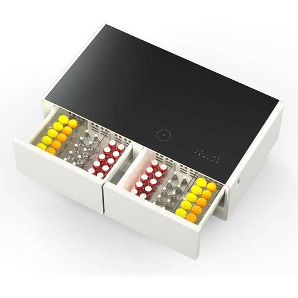 La table à café intelligente Forno Evoluto Tavolo de 51 pouces blanche allie design épuré et fonctionnalités intelligentes, avec deux tiroirs réfrigérés, des haut-parleurs Bluetooth intégrés, la recharge sans fil et des commandes tactiles — le tout dans une pièce maîtresse élégante.