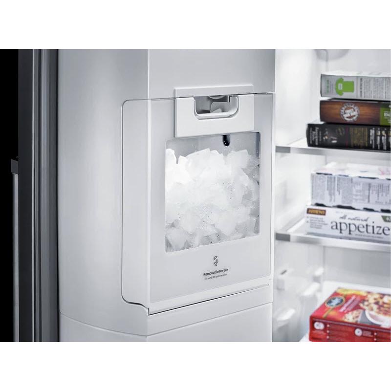 Ajoute de l'espace sur les clayettes à l'intérieur du réfrigérateur grâce au bac à glaçons qui se monte à l'intérieur de la porte gauche plutôt que dans le compartiment réfrigérateur.