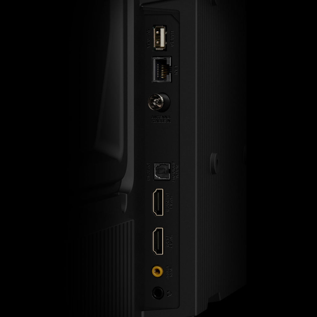 Deux ports HDMI (un avec ARC), une entrée vidéo composite + une entrée audio gauche et droite (miniconnecteur 3,5 mm), une sortie audio numérique optique, une prise pour écouteurs et un port USB multimédia offrant des options de connectivité polyvalentes