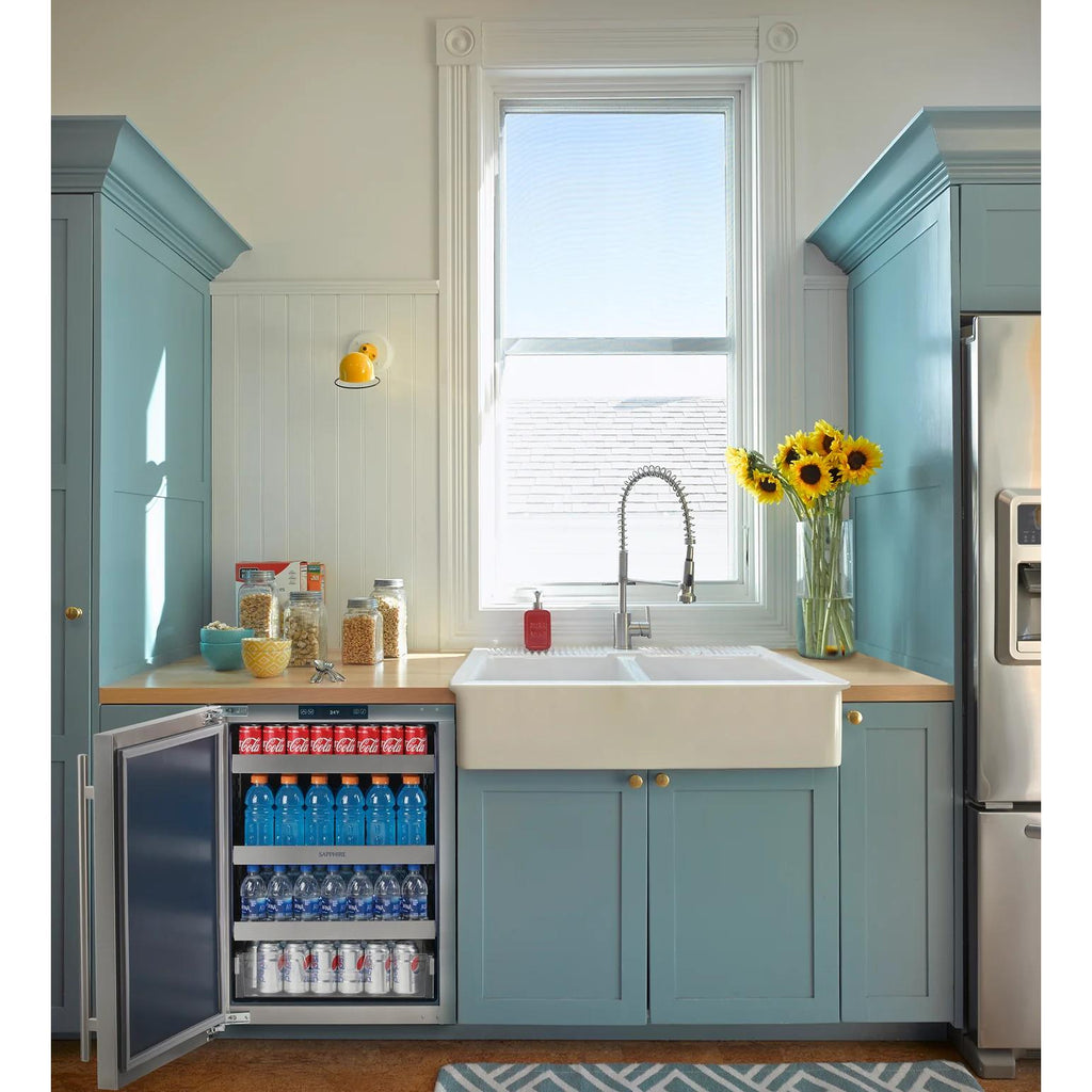 Parfait pour votre cuisine, bar, gym ou cinéma maison, le réfrigérateur intérieur Sapphire offre une optimisation maximale du rangement. Ce réfrigérateur respecte la hauteur ADA et s’installe sous des comptoirs de 34 pouces. Ce réfrigérateur compact mesure 24" de large et offre 4,7 pieds cubes de rangement. Elle présente un extérieur en acier inoxydable durable et notre intérieur signature bleu saphir. Ce modèle en acier inoxydable comprend une poignée en acier inoxydable de 24 » de long et 1 » de diamètre avec des entretoises facettées. La plage de température de 34°F à 65°F garde vos aliments et boissons parfaitement au frais, tandis que le système de refroidissement assisté par ventilateur permet des températures uniformes, des temps de refroidissement plus rapides et une efficacité accrue. Le système de rangement adaptable comprend 3 étagères à extension complète à l’avant en acier inoxydable avec inserts en fil chromé pour garder vos bouteilles et canettes organisées, tandis qu’un tiroir à légumes transparent au bas est idéal pour entreposer les fruits et légumes. L’éclairage DEL pleine longueur permet de voir clairement ce qu’il y a à l’intérieur du frigo. Le panneau de contrôle électronique tactile capacitif multifonction est facile à utiliser. Cet appareil comprend une grille adaptable permettant un alignement exact avec les armoires adjacentes et la possibilité de concevoir un coup de pied continu vers le bout de l’armoire. L’unité dispose d’un système de dégivrage automatique et de quatre pattes de nivellement. Pour une optimisation maximale du rangement dans votre maison en respectant les exigences de hauteur ADA, choisissez ce réfrigérateur intérieur saphir.